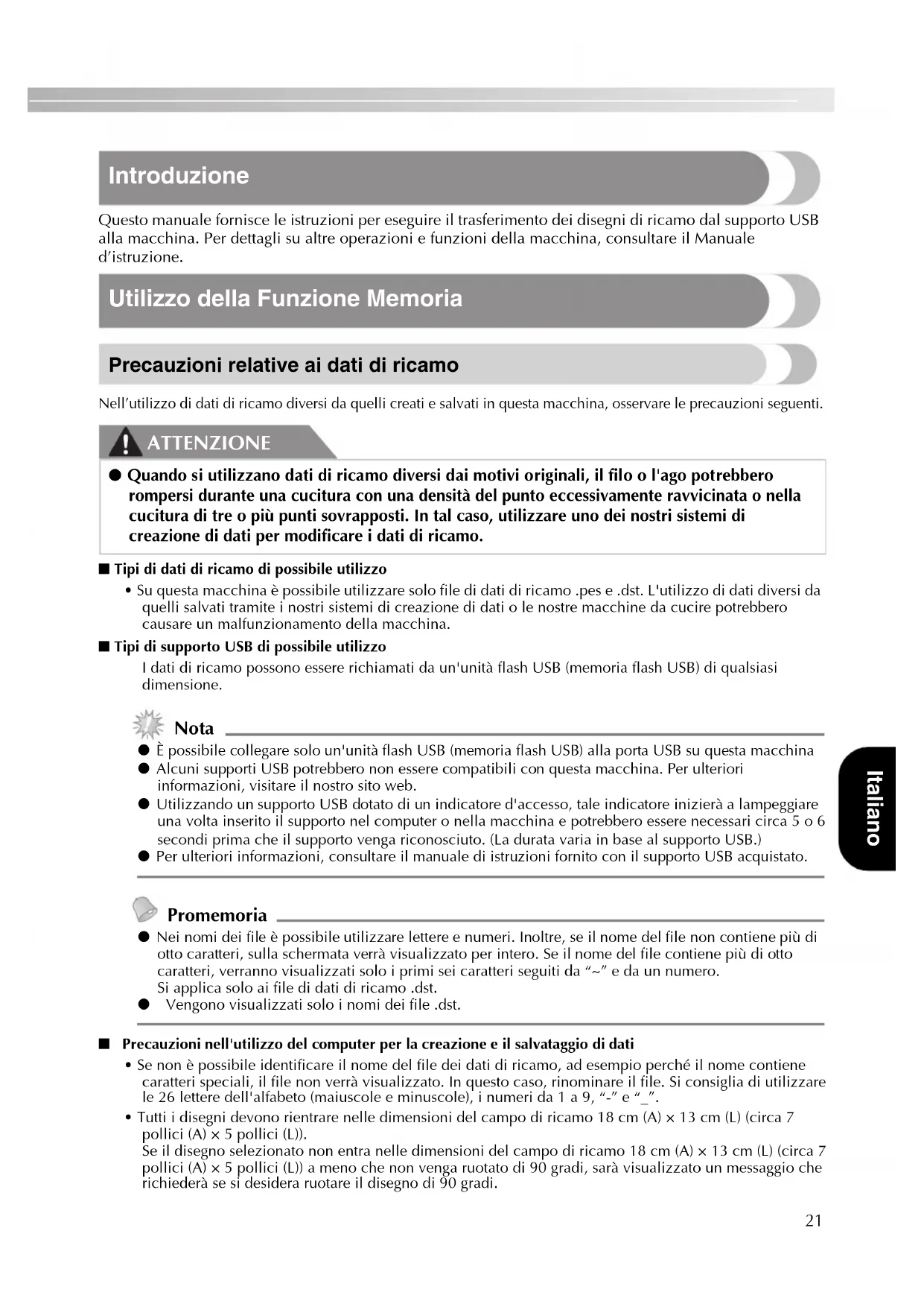 Verwijder het USB-medium en zet de machine uit en weer aan.21 — — — — — — — — — — — — — — — — — — — — — — — — — — — — — — — — — — — — — — — — — — — — — — — — — — Italiano Introduzione Questo manuale fornisce le istruzioni per eseguire il trasferimento dei disegni di ricamo dal supporto USB alla macchina. Per dettagli su altre operazioni e funzioni della macchina, consultare il Manuale d’istruzione. Utilizzo della Funzione Memoria Precauzioni relative ai dati di ricamo Nell’utilizzo di dati di ricamo diversi da quelli creati e salvati in questa macchina, osservare le precauzioni seguenti. ATTENZIONE ■ Tipi di dati di ricamo di possibile utilizzo• Su questa macchina è possibile utilizzare solo file di dati di ricamo .pes e .dst. L'utilizzo di dati diversi da quelli salvati tramite i nostri sistemi di creazione di dati o le nostre macchine da cucire potrebbero causare un malfunzionamento della macchina.■ Tipi di supporto USB di possibile utilizzoI dati di ricamo possono essere richiamati da un'unità flash USB (memoria flash USB) di qualsiasi dimensione. Nota z È possibile collegare solo un'unità flash USB (memoria flash USB) alla porta USB su questa macchina z Alcuni supporti USB potrebbero non essere compatibili con questa macchina. Per ulteriori informazioni, visitare il nostro sito web. z Utilizzando un supporto USB dotato di un indicatore d'accesso, tale indicatore inizierà a lampeggiare una volta inserito il supporto nel computer o nella macchina e potrebbero essere necessari circa 5 o 6 secondi prima che il supporto venga riconosciuto. (La durata varia in base al supporto USB.) z Per ulteriori informazioni, consultare il manuale di istruzioni fornito con il supporto USB acquistato. Promemoria z Nei nomi dei file è possibile utilizzare lettere e numeri. Inoltre, se il nome del file non contiene più di otto caratteri, sulla schermata verrà visualizzato per intero. Se il nome del file contiene più di otto caratteri, verranno visualizzati solo i primi sei caratteri seguiti da “~” e da un numero. Si applica solo ai file di dati di ricamo .dst.z Vengono visualizzati solo i nomi dei file .dst. ■ Precauzioni nell'utilizzo del computer per la creazione e il salvataggio di dati