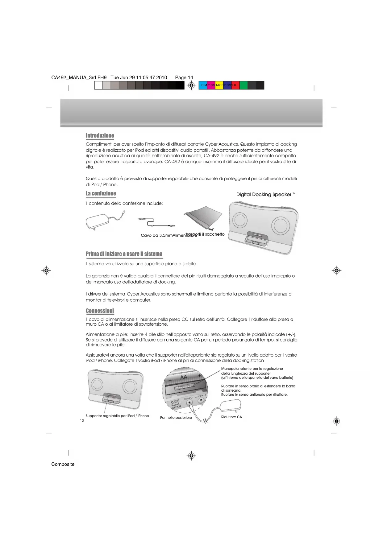 Complimenti per aver scelto limpianto di diffusori portatile Cyber Acoustics. Questo impianto di docking digitale è realizzato per iPod ed altri dispositivi audio portatili. Abbastanza potente da diffondere una riproduzione acustica di qualità nellambiente di ascolto, CA-492 è anche sufficientemente compatto per poter essere trasportato ovunque. CA-492 è dunque insomma il diffusore ideale per il vostro stile di vita. Questo prodotto è provvisto di supporter regolabile che consente di proteggere il pin di differenti modelli di iPod / iPhone. Introduzione Il sistema va utilizzato su una superficie piana e stabile La garanzia non è valida qualora il connettore del pin risulti danneggiato a seguito dell'uso improprio o del mancato uso dell'adattatore di docking. I drivers del sistema Cyber Acoustics sono schermati e limitano pertanto la possibilità di interferenze ai monitor di televisori e computer. Prima di iniziare a usare il sistema Digital Docking Speaker