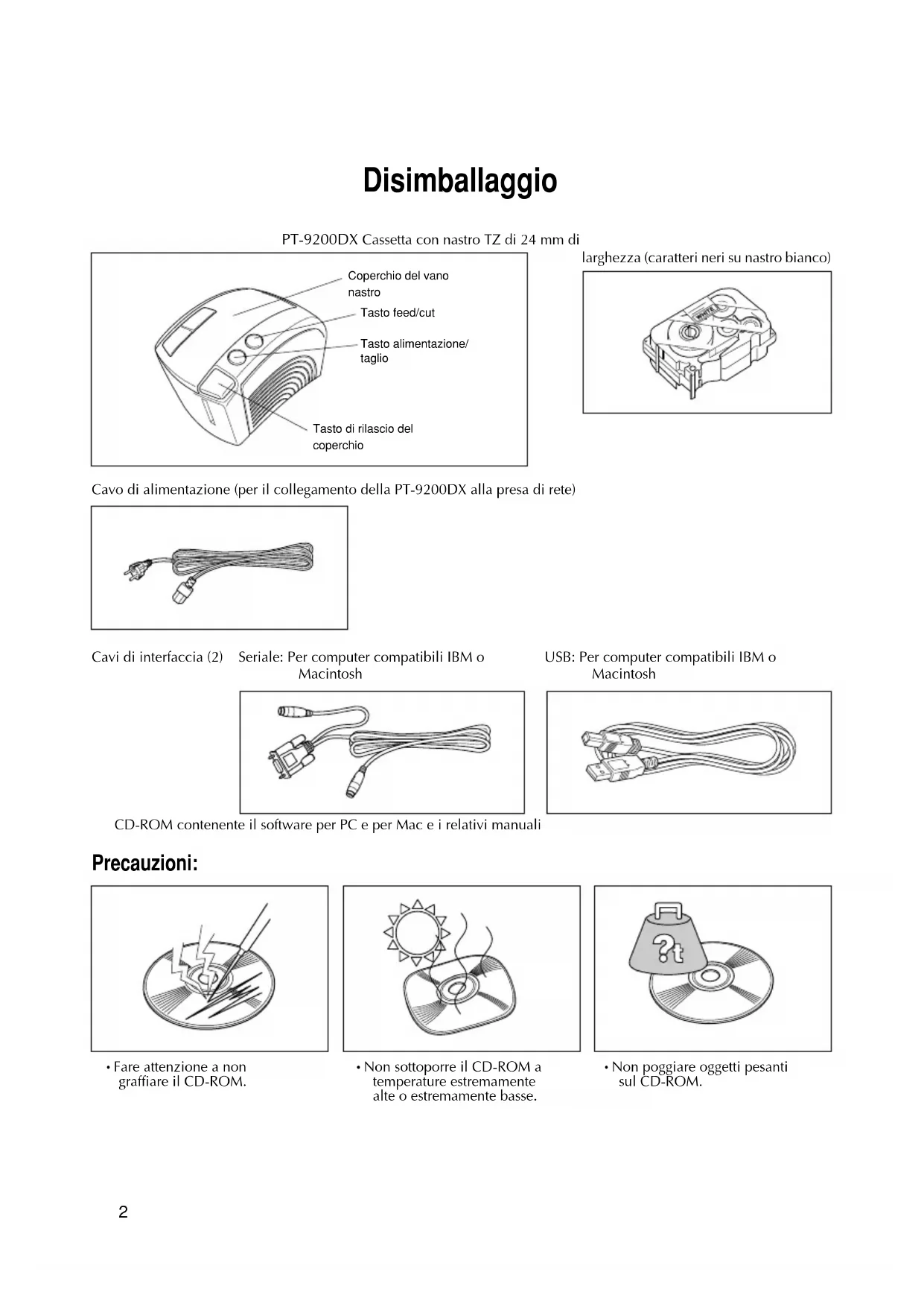 - Accessori Disimballaggio PT-9200DX Cassetta con nastro TZ di 24 mm di larghezza (caratteri neri su nastro bianco) CD-ROM contenente il software per PC e per Mac e i relativi manuali Precauzioni: p. 332