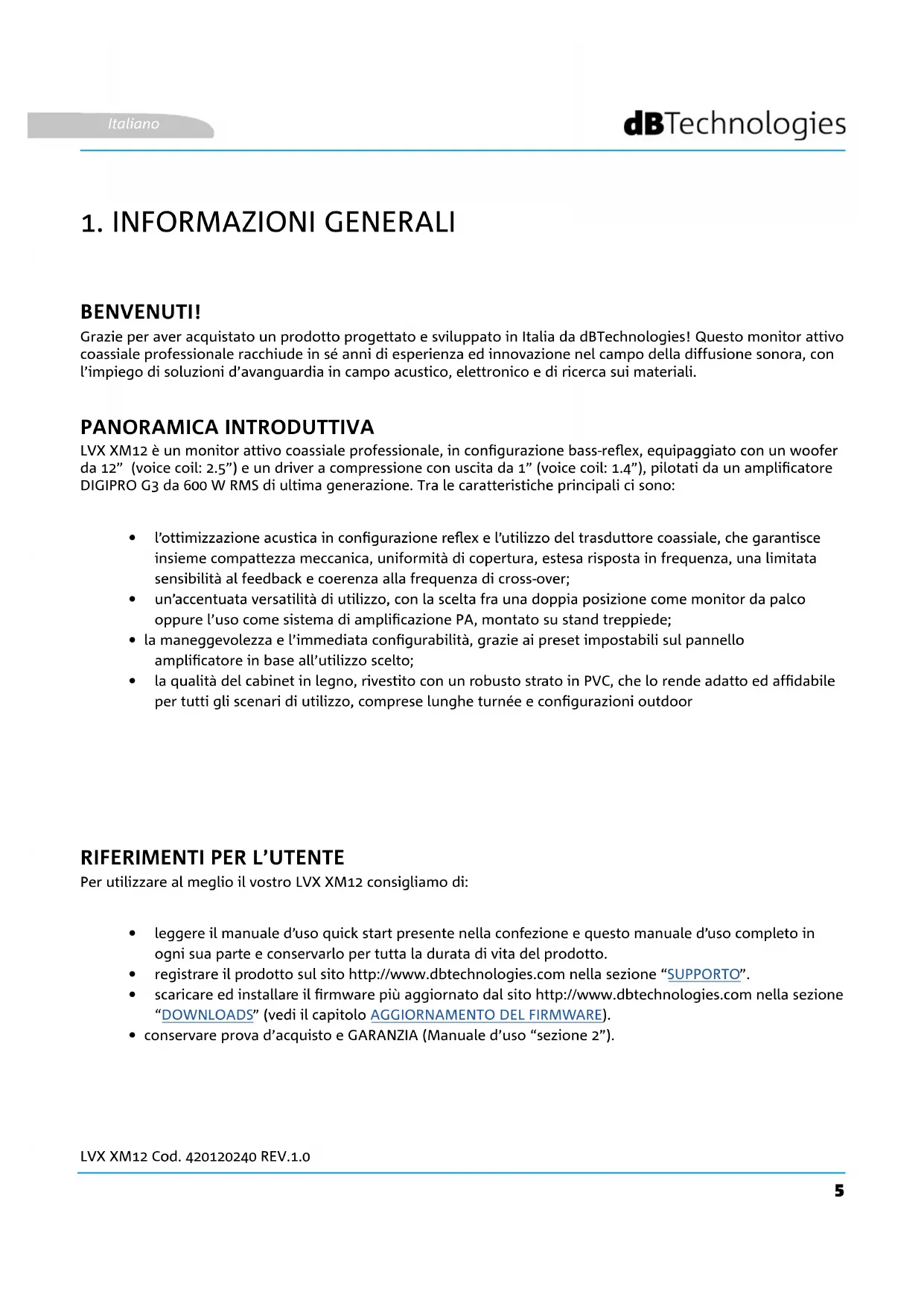 Grazie per aver acquistato un prodotto progettato e sviluppato in Italia da dBTechnologies! Questo monitor attivo coassiale professionale racchiude in sé anni di esperienza ed innovazione nel campo della diffusione sonora, con l’impiego di soluzioni d’avanguardia in campo acustico, elettronico e di ricerca sui materiali. LVX XM12 è un monitor attivo coassiale professionale, in congurazione bass-reex, equipaggiato con un woofer da 12” (voice coil: 2.5”) e un driver a compressione con uscita da 1” (voice coil: 1.4”), pilotati da un amplicatore DIGIPRO G3 da 600 W RMS di ultima generazione. Tra le caratteristiche principali ci sono: Per utilizzare al meglio il vostro LVX XM12 consigliamo di: