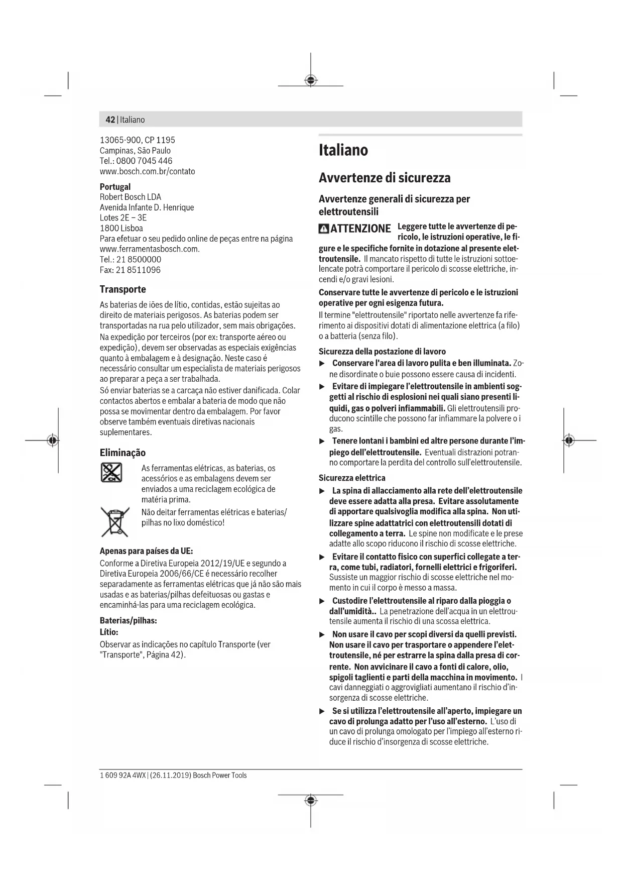 Il livello di rumorosità ponderato A dell’elettroutensile è tipi- camente di: Livello di pressione acustica 87dB(A); Livello di potenza sonora 98dB(A). Grado d’incertezza K=5dB. Indossare protezioni per l’udito. GSR 14,4V-EC GSR 18V-EC GSB 14,4V-EC GSB 18V-EC Valori di oscillazione totali a