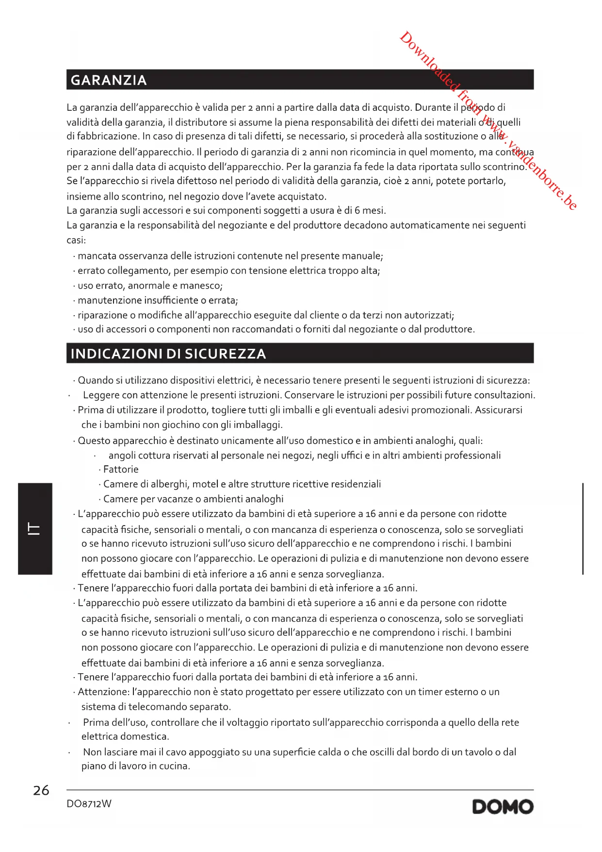 - Non lasciare mai il cavo appoggiato su una supercie calda o che oscilli dal bordo di un tavolo o dal piano di lavoro in cucina. Downloaded from www.vandenborre.be27 DO8712W www.domo-elektro.be