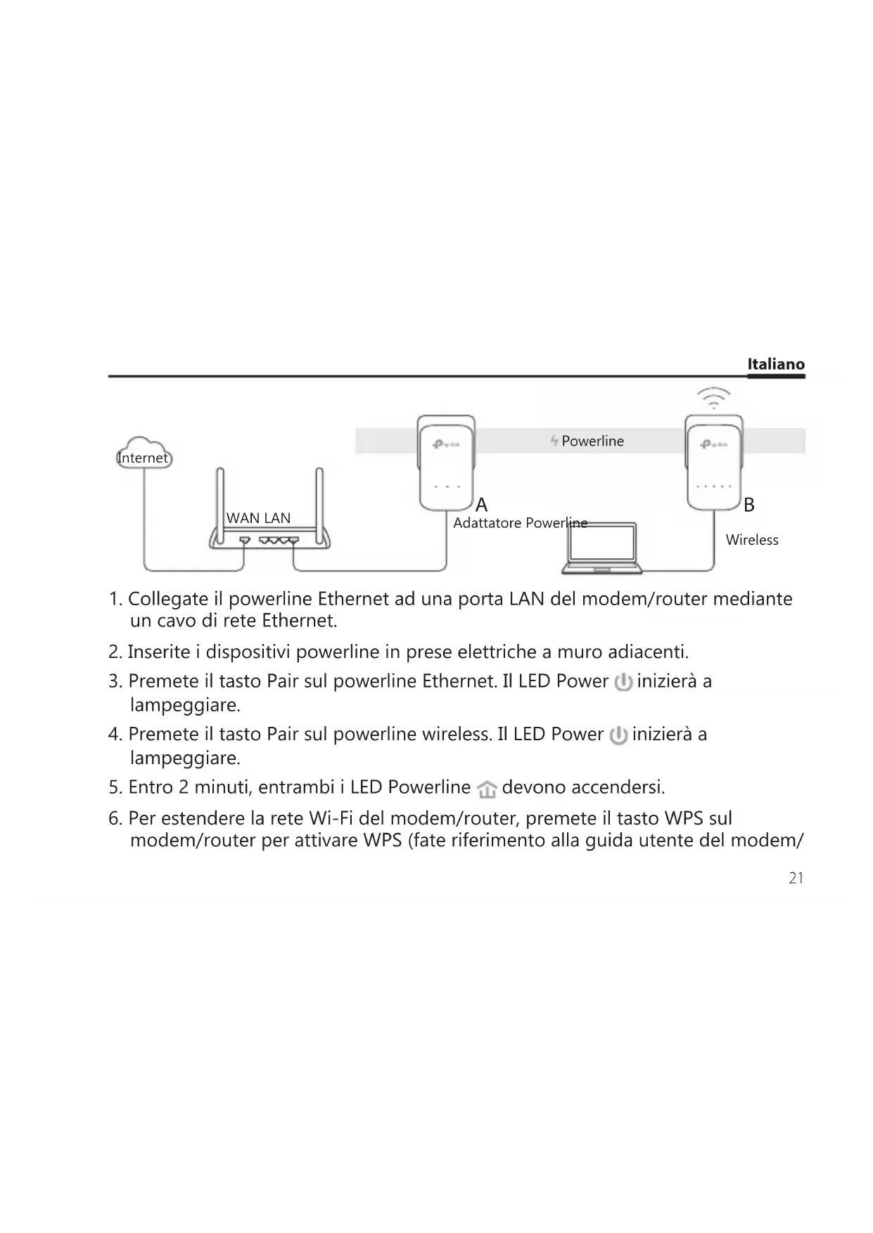 modem/router per attivare WPS (fate riferimento alla guida utente del modem/ Internet WAN LAN Adattatore Powerline Wireless PowerlineItaliano