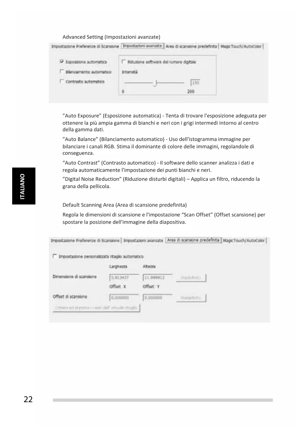 ”AutoExposure”(Esposizioneautomatica)‐Tentaditrovarel'esposizioneadeguataper ottenerelapiùampiagammadibianchienericonigrigiintermediintornoalcentro dellagammadati. ”AutoBalance”(Bilanciamentoautomatico)‐Usodell'istogrammaimmagineper bilanciareicanaliRGB.Stimaildominantedicoloredelleimmagini,regolandoledi conseguenza.“AutoCo ntrast”(Contrastoautomatico)‐Ilsoftwaredelloscanneranalizzaidatie regolaautomaticamentel'impostazionedeipuntibianchieneri. ”DigitalNoiseR eduction”(Riduzionedisturbidigitali)–Applicaunfiltro,riducendola granadellapellicola.