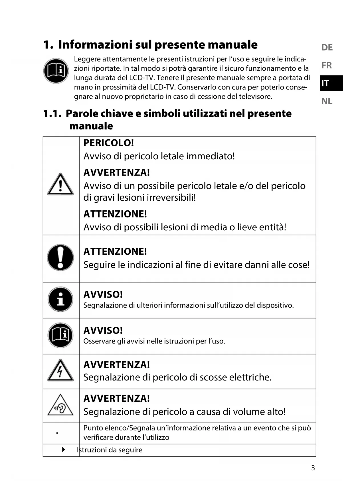 Leggere attentamente le presenti istruzioni per l’uso e seguire le indica- zioni riportate. In tal modo si potrà garantire il sicuro funzionamento e la lunga durata del LCD-TV. Tenere il presente manuale sempre a portata di mano in prossimità del LCD-TV. Conservarlo con cura per poterlo conse- gnare al nuovo proprietario in caso di cessione del televisore. 1.1. Parole chiave e simboli utilizzati nel presente manuale PERICOLO! Avviso di pericolo letale immediato! AVVERTENZA! Avviso di un possibile pericolo letale e/o del pericolo di gravi lesioni irreversibili! ATTENZIONE! Avviso di possibili lesioni di media o lieve entità! ATTENZIONE! Seguire le indicazioni al fine di evitare danni alle cose! AVVISO! Segnalazione di ulteriori informazioni sull’utilizzo del dispositivo. AVVISO! Osservare gli avvisi nelle istruzioni per l’uso. AVVERTENZA! Segnalazione di pericolo di scosse elettriche. AVVERTENZA! Segnalazione di pericolo a causa di volume alto!