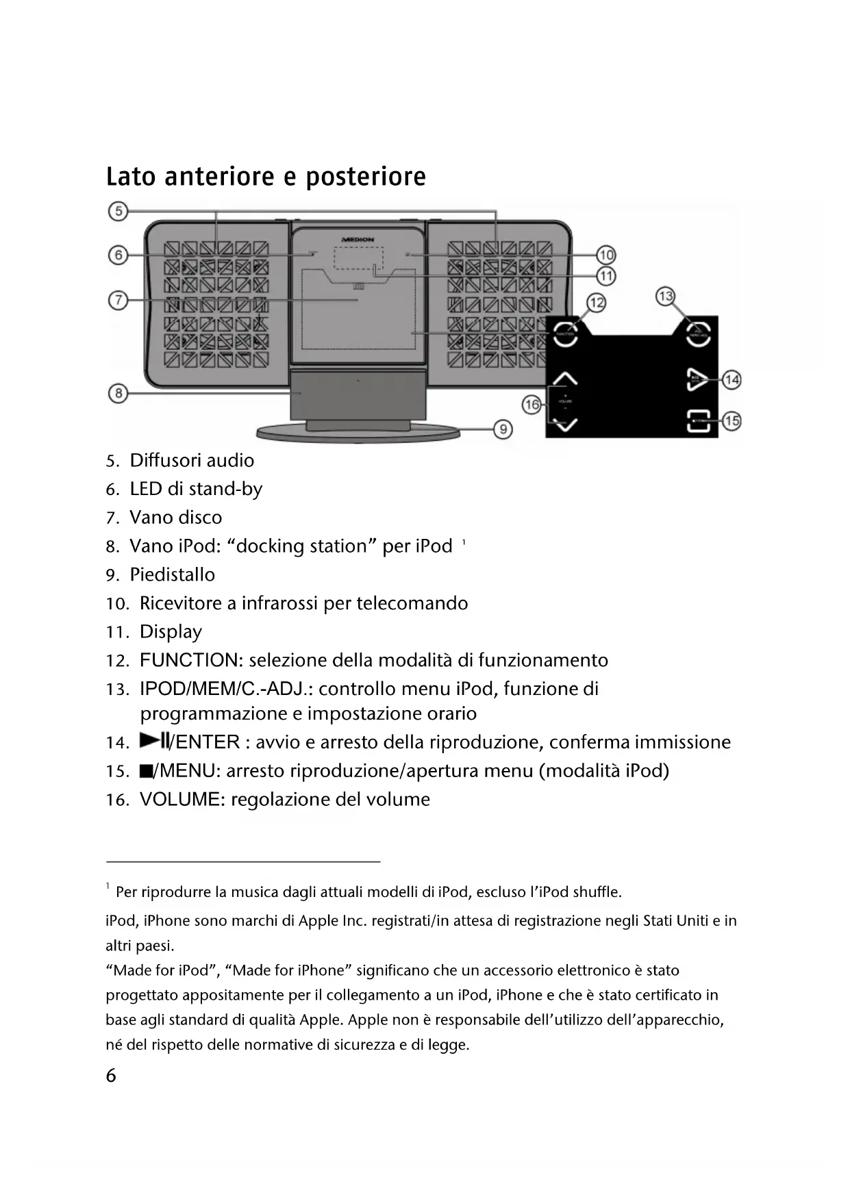 Per riprodurre la musica dagli attuali modelli di iPod, escluso l’iPod shuffle. iPod, iPhone sono marchi di Apple Inc. registrati/in attesa di registrazione negli Stati Uniti e in altri paesi. “Made for iPod”, “Made for iPhone” significano che un accessorio elettronico è stato progettato appositamente per il collegamento a un iPod, iPhone e che è stato certificato in base agli standard di qualità Apple. Apple non è responsabile dell’utilizzo dell’apparecchio, né del rispetto delle normative di sicurezza e di legge.7