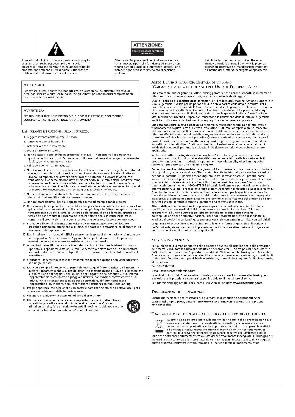indicati dal produttore o venduti insieme all’apparecchio. Qualora si utilizzi un carrello, fare attenzione durante il movimento dell’apparecchio al fine di evitare danni causati da un’eventuale caduta. ALTEC LANSING GARANZIA LIMITATA DI UN ANNO (GARANZIA LIMITATA DI DUE ANNI PER UNIONE EUROPEA E ASIA) Che cosa copre questa garanzia? Altec Lansing garantisce che i propri prodotti sono esenti da difetti nei materiali e nella lavorazione, salvo eccezioni indicate di seguito. Qual è il periodo di copertura della garanzia? Per i prodotti acquistati nell’Unione Europea e in Asia, la garanzia è valida per un periodo di due anni a partire dalla data di acquisto. Per i prodotti acquistati al di fuori dell’Unione Europea ed Asia, la garanzia è valida per un periodo di un anno a partire dalla data di acquisto. Eventuali garanzie implicite previste dalle leggi vigenti saranno soggette ai limiti di durata stabiliti nella garanzia limitata. Alcuni Stati e/o Stati membri dell’Unione Europea non consentono la limitazione della durata della garanzia implicita; in tal caso, la limitazione di cui sopra potrebbe non essere applicabile. Che cosa non copre questa garanzia? La presente garanzia non si applica a difetti, cattivo funzionamento o guasti dovuti a errata installazione, utilizzo improprio o abuso, mancato utilizzo o utilizzo errato delle informazioni fornite, utilizzo con apparecchiature non idonee o difettose. (Per informazioni sull’installazione, sul funzionamento e sull’utilizzo del prodotto, consultare la Guida fornita con il prodotto. Qualora si desideri un manuale aggiuntivo, sarà possibile scaricarlo dal sito www.alteclansing.com). La presente garanzia non copre i danni indiretti o accidentali. Alcuni Stati non consentono l’esclusione o la limitazione dei danni accidentali o indiretti, pertanto la suddetta limitazione o esclusione potrebbe non essere applicabile. In che modo Altec Lansing rimedierà al problema? Altec Lansing, a propria discrezione, riparerà o sostituirà il prodotto rivelatosi difettoso nei materiali o nella lavorazione. Se il prodotto non fosse più in produzione oppure non fosse disponibile, Altec Lansing potrà sostituire il prodotto con uno similare o migliore. Come ottenere il servizio previsto dalla garanzia? Per ottenere la riparazione o la sostituzione di un prodotto, occorre contattare Altec Lansing tramite indirizzo di posta elettronica entro il periodo di garanzia (csupport@alteclansing.com). Sarà necessario fornire il proprio nome, indirizzo, indirizzo di posta elettronica, numero di telefono, data di acquisto e una descrizione completa del problema riscontrato. Negli Stati Uniti è possibile contattare Altec Lansing tramite telefono al numero 1-800-ALTEC88 (si consiglia di tenere a portata di mano le stesse informazioni). Qualora i prodotti dovessero presentare difetti nei materiali o nella lavorazione, Altec Lansing fornirà un’autorizzazione di reso e le istruzioni per la spedizione del reso. Le spese di spedizione del reso sono a carico del produttore e il reso deve essere accompagnato dalla prova di acquisto originale. L’utente è responsabile della ricezione del prodotto da parte di Altec Lansing, pertanto è tenuto a garantire una corretta spedizione. Effetto delle normative nazionali. La presente garanzia conferisce all’utente diritti legali specifici, oltre ad eventuali altri diritti che possono variare da Stato a Stato. Gli utenti appartenenti all’Unione Europea potrebbero beneficiare di altri diritti derivanti dall’applicazione delle normative nazionali dei singoli Stati membri, atte a disciplinare la vendita dei prodotti Altec Lansing. La presente garanzia non entra in conflitto con tali diritti. Le garanzie e i provvedimenti sopra citati sono le uniche forme di garanzia a disposizione dell’acquirente, sia nel caso in cui lo prevedano specifiche normative nazionali in vigore che per tutti quegli ambiti in cui risultano applicabili. SERVIZIO POSTVENDITA Per la soluzione alla maggior parte delle domande riguardo all’installazione e alle prestazioni del sistema, consultare la Guida alla risoluzione dei problemi. È inoltre possibile consultare le FAQ all’interno della sezione Supporto clienti del sito Web www.alteclansing.com. Ai clienti in America settentrionale che non sono riusciti a trovare le informazioni desiderate, si consiglia di contattare il Servizio clienti per richiedere assistenza, prima di riconsegnare l’unità, in garanzia, al rivenditore. Tel: 800-258-3288 E-mail: csupport@alteclansing.com I clienti al di fuori dall’America settentrionale possono visitare il sito www.alteclansing.com e selezionare la propria area geografica per individuare il rivenditore di zona. Per informazioni aggiornate, consultare il sito Web all’indirizzo www.alteclansing.com. DISTRIBUZIONE INTERNAZIONALE Clienti internazionali: per informazioni riguardanti la distribuzione dei prodotti Altec Lansing nel proprio paese, visitare il sito www.alteclansing.com e selezionare la propria area geografica. TRATTAMENTO DEL DISPOSITIVO ELETTRICO O ELETTRONICO A FINE VITA Questo simbolo sul prodotto o sulla sua confezione indica che il prodotto non deve essere considerato come un normale rifiuto domestico, ma deve invece essere consegnato ad un punto di raccolta appropriato per il riciclo di apparecchi elettrici ed elettronici. Assicurandosi che questo prodotto sia smaltito correttamente, si contribuirà a prevenire potenziali conseguenze negative per l’ambiente e per la salute che potrebbero altrimenti essere causate dal suo smaltimento inadeguato. Il riciclaggio dei materiali aiuta a conservare le risorse naturali. Per informazioni dettagliate circa il riciclaggio di questo prodotto, contattare l’ufficio comunale o il servizio locale di smaltimento rifiuti. ATTENZIONE Per evitare le scosse elettriche, non utilizzare questa spina (polarizzata) con cavo di prolunga, innesto o altra uscita, salvo che gli spinotti possano inserir
