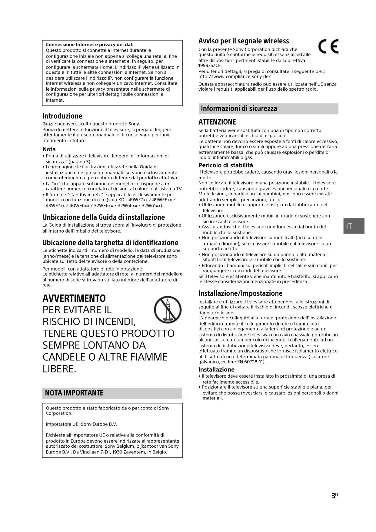 - Posizionare il televisore su una superficie stabile e piana, per evitare che possa rovesciarsi e causare lesioni personali o danni materiali. Connessione Internet e privacy dei dati Questo prodotto si connette a Internet durante la configurazione iniziale non appena si collega una rete, al fine di verificare la connessione a Internet e, in seguito, per configurare la schermata Home. L’indirizzo IP viene utilizzato in questa e in tutte le altre connessioni a Internet. Se non si desidera utilizzare l’indirizzo IP, non configurare la funzione Internet wireless e non collegare un cavo Internet. Consultare le informazioni sulla privacy presentate nelle schermate di configurazione per ulteriori dettagli sulle connessioni a Internet. NOTA IMPORTANTE Questo prodotto è stato fabbricato da o per conto di Sony Corporation. Importatore UE: Sony Europe B.V. Richieste all’importatore UE o relative alla conformità di prodotto in Europa devono essere indirizzate al rappresentante autorizzato del costruttore, Sony Belgium, bijkantoor van Sony Europe B.V., Da Vincilaan 7-D1, 1930 Zaventem, in Belgio. Informazioni di sicurezza4