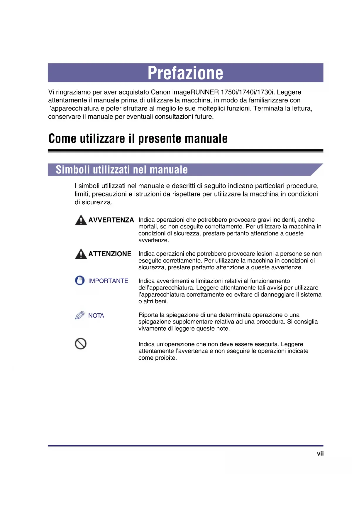 Verbrauchsmaterial Druck-/Kopiermaterial, 4-19 Heftklammermagazin, 4-21 Toner, 4-20 Trommeleinheit, 4-21 Verfügbare Funktionen, xii Vordere Führungsschiene, 4-6 Vorsichtsmaßnahmen für die Handhabung, 1-6imageRUNNER 1750i/1740i/1730i Guida per l’utenteManuali per questa apparecchiatura I manuali redatti per questa apparecchiatura sono organizzati come indicato di seguito. Consultare i manuali per avere informazioni dettagliate sull’argomento desiderato. Con alcune configurazioni di sistema e particolari prodotti, alcuni manuali potrebbero non essere necessari. Questo simbolo indica i manuali stampati. CD-ROM Le guide contraddistinte da questo simbolo sono manuali in pdf inclusi nel CD fornito