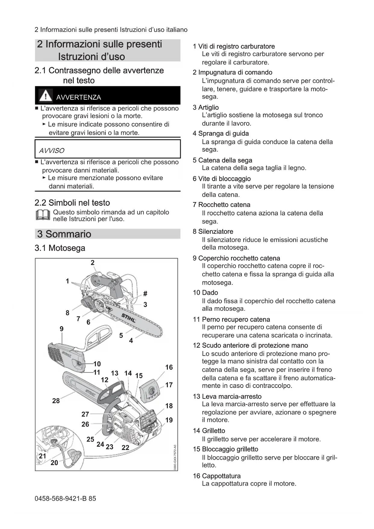 0000-GXX-7572-A0 1 Viti di registro carburatore Le viti di registro carburatore servono per regolare il carburatore. 2 Impugnatura di comando L’impugnatura di comando serve per control‐ lare, tenere, guidare e trasportare la moto‐ sega. 3 Artiglio L’artiglio sostiene la motosega sul tronco durante il lavoro. 4 Spranga di guida La spranga di guida conduce la catena della sega. 5 Catena della sega La catena della sega taglia il legno. 6 Vite di bloccaggio Il tirante a vite serve per regolare la tensione della catena. 7 Rocchetto catena Il rocchetto catena aziona la catena della sega. 8 Silenziatore Il silenziatore riduce le emissioni acustiche della motosega. 9 Coperchio rocchetto catena Il coperchio rocchetto catena copre il roc‐ chetto catena e fissa la spranga di guida alla motosega. 10 Dado Il dado fissa il coperchio del rocchetto catena alla motosega. 11 Perno recupero catena Il perno per recupero catena consente di recuperare una catena scaricata o incrinata. 12 Scudo anteriore di protezione mano Lo scudo anteriore di protezione mano pro‐ tegge la mano sinistra dal contatto con la catena della sega, serve per inserire il freno della catena e fa scattare il freno automatica‐ mente in caso di contraccolpo. 13 Leva marcia-arresto La leva marcia-arresto serve per effettuare la regolazione per avviare, azionare o spegnere il motore. 14 Grilletto Il grilletto serve per accelerare il motore. 15 Bloccaggio grilletto Il bloccaggio grilletto serve per bloccare il gril‐ letto. 16 Cappottatura La cappottatura copre il motore. 2 Informazioni sulle presenti Istruzioni d’uso italiano 0458-568-9421-B 8517 Chiusura della cappottatura La chiusura della cappottatura fissa la cap‐ pottatura sulla motosega. 18 Filtro aria Il filtro aria filtra l’aria aspirata dal motore. 19 Occhiello L’occhiello serve per agganciare la motosega durante i lavori sull’albero. 20 Raccordo candela di accensione Il raccordo candela di accensione collega il cavo di accensione alla candela di accen‐ sione. 21 Candela di accensione La candela di accensione innesca la miscela carburante-aria nel motore. 22 Pompa carburante manuale La pompa carburante manuale semplifica l’avviamento del motore. 23 Leva farfalla di avviamento La leva farfalla di avviamento serve per avviare il motore. 24 Impugnatura di avviamento L’impugnatura di avviamento serve per avviare il motore. 25 Manico tubolare Il manico tubolare serve per tenere e guidare la motosega. 26 Tappo del serbatoio Il tappo del serbatoio chiude il serbatoio del‐ l'olio. 27 Tappo del serbatoio del carburante Il tappo del serbatoio del carburante chiude il serbatoio del carburante. 28 Riparo catena Il riparo catena protegge dal contatto con la catena della sega. # Numero di matricola