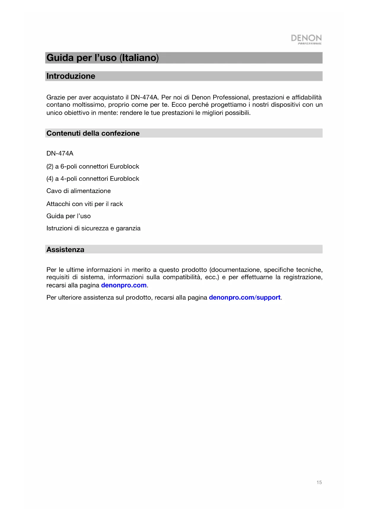 CH A CH B CH C CH D15 Guida per l’uso (Italiano) Introduzione Grazie per aver acquistato il DN-474A. Per noi di Denon Professional, prestazioni e affidabilità contano moltissimo, proprio come per te. Ecco perché progettiamo i nostri dispositivi con un unico obiettivo in mente: rendere le tue prestazioni le migliori possibili. Contenuti della confezione DN-474A (2) a 6-poli connettori Euroblock (4) a 4-poli connettori Euroblock Cavo di alimentazione Attacchi con viti per il rack Guida per l’uso Istruzioni di sicurezza e garanzia Assistenza Per le ultime informazioni in merito a questo prodotto (documentazione, specifiche tecniche, requisiti di sistema, informazioni sulla compatibilità, ecc.) e per effettuarne la registrazione, recarsi alla pagina denonpro.com. Per ulteriore assistenza sul prodotto, recarsi alla pagina denonpro.com/support.16 Caratteristiche Pannello anteriore
