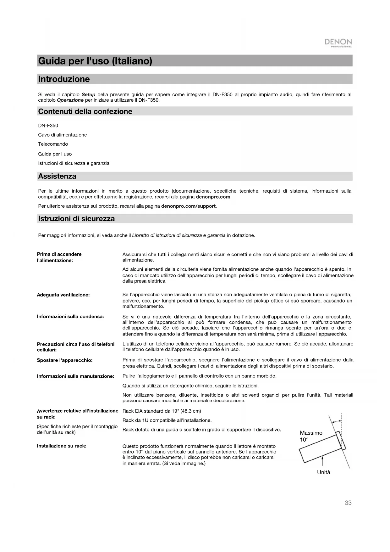 Contenuti della confezione DN-F350 Cavo di alimentazione Telecomando Guida per l'uso Istruzioni di sicurezza e garanzia Assistenza Per le ultime informazioni in merito a questo prodotto (documentazione, specifiche tecniche, requisiti di sistema, informazioni sulla compatibilità, ecc.) e per effettuarne la registrazione, recarsi alla pagina denonpro.com. Per ulteriore assistenza sul prodotto, recarsi alla pagina denonpro.com/support. Istruzioni di sicurezza Per maggiori informazioni, si veda anche il Libretto di istruzioni di sicurezza e garanzia in dotazione. Prima di accendere l'alimentazione: