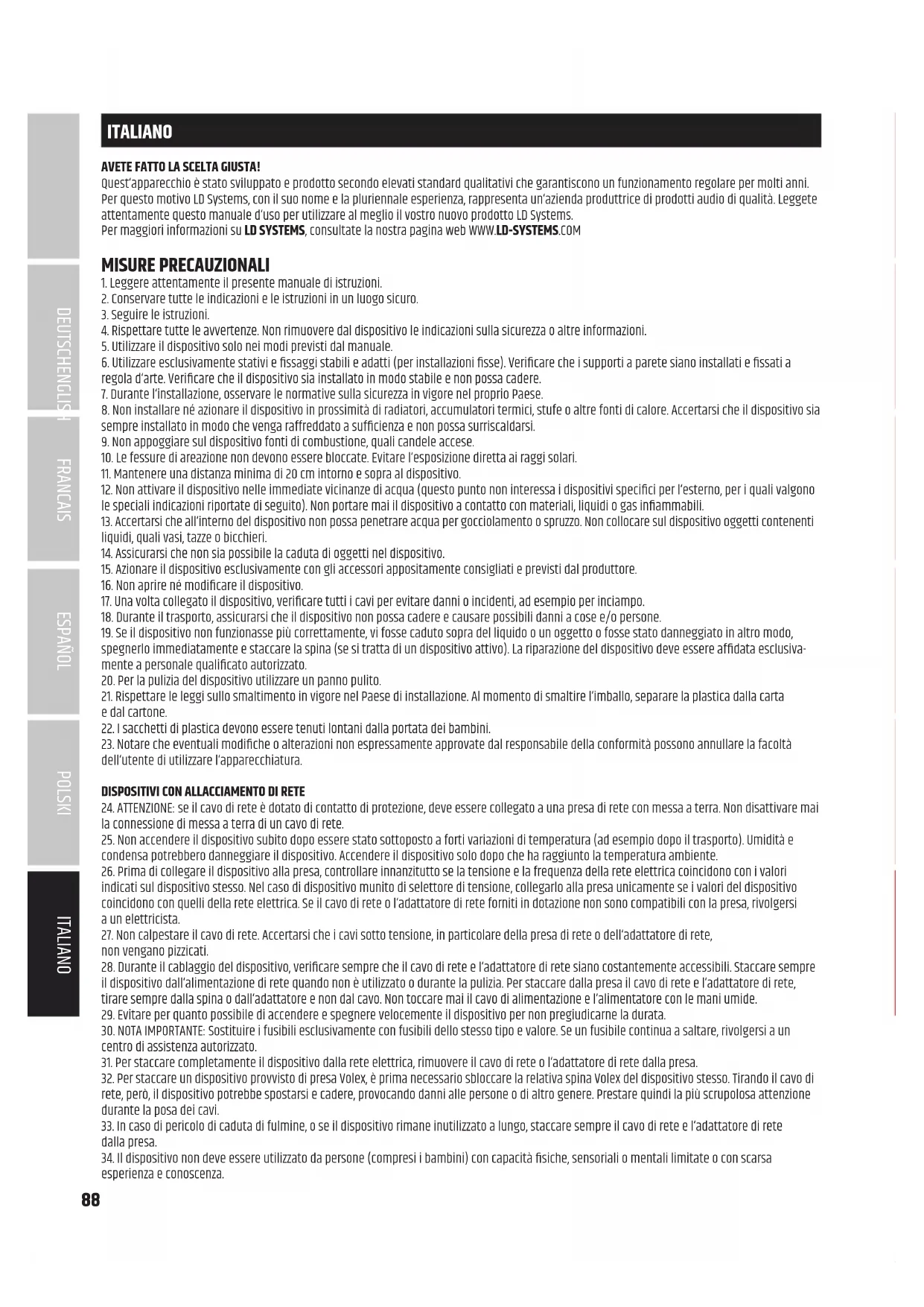 DEUTSCHFRANCAIS ESPAÑOL ENGLISH ITALIANO POLSKIITALIANO AVETE FATTO LA SCELTA GIUSTA! Quest‘apparecchio è stato sviluppato e prodotto secondo elevati standard qualitativi che garantiscono un funzionamento regolare per molti anni. Per questo motivo LD Systems, con il suo nome e la pluriennale esperienza, rappresenta un‘azienda produttrice di prodotti audio di qualità. Leggete attentamente questo manuale d‘uso per utilizzare al meglio il vostro nuovo prodotto LD Systems. Per maggiori informazioni su LD SYSTEMS, consultate la nostra pagina web WWW.LD-SYSTEMS.COM MISURE PRECAUZIONALI