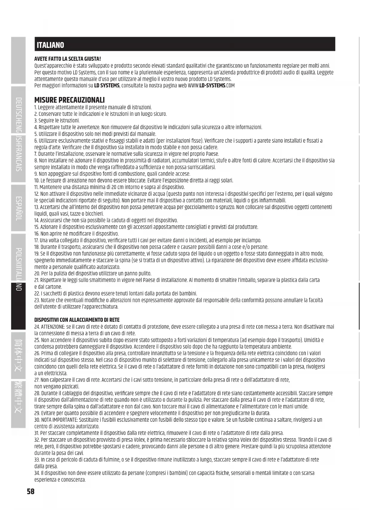 ITALIANO AVETE FATTO LA SCELTA GIUSTA! Quest‘apparecchio è stato sviluppato e prodotto secondo elevati standard qualitativi che garantiscono un funzionamento regolare per molti anni. Per questo motivo LD Systems, con il suo nome e la pluriennale esperienza, rappresenta un‘azienda produttrice di prodotti audio di qualità. Leggete attentamente questo manuale d‘uso per utilizzare al meglio il vostro nuovo prodotto LD Systems. Per maggiori informazioni su LD SYSTEMS, consultate la nostra pagina web WWW.LD-SYSTEMS.COM MISURE PRECAUZIONALI