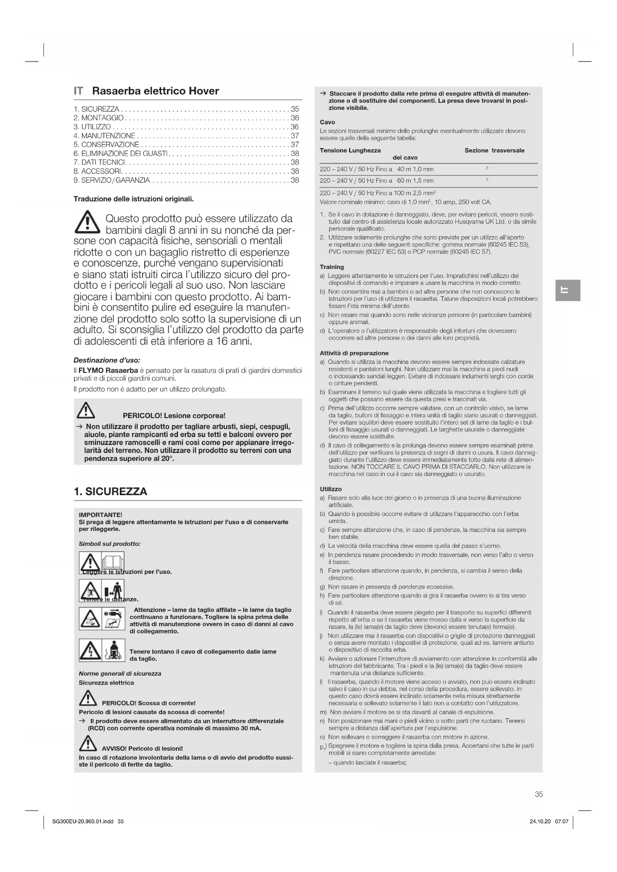 ) Spegnere il motore e togliere la spina dalla presa. Accertarsi che tutte le parti mobili si siano completamente arrestate: – quando lasciate il rasaerba; SG300EU-20.960.01.indd 35 24.10.20 07:07IT