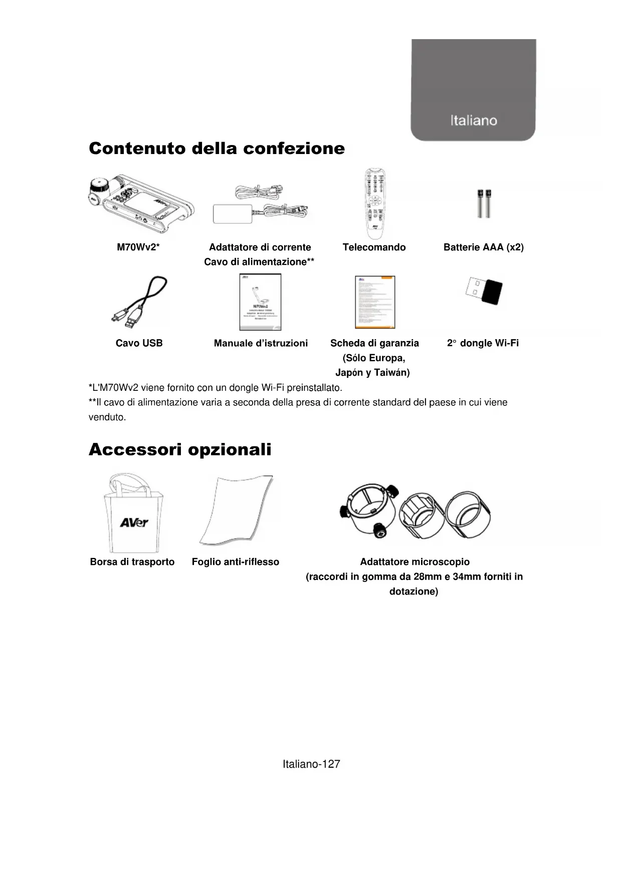 Cavo USB Manuale d’istruzioni Scheda di garanzia (Sólo Europa, Japón y Taiwán) 2° dongle Wi-Fi *L'M70Wv2 viene fornito con un dongle Wi-Fi preinstallato. **Il cavo di alimentazione varia a seconda della presa di corrente standard del paese in cui viene venduto. Accessori opzionali