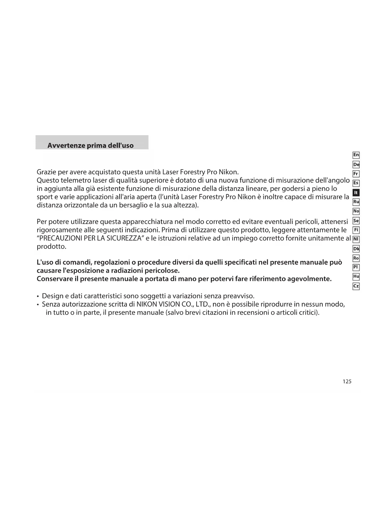 Avvertenze prima dell'uso Grazie per avere acquistato questa unità Laser Forestry Pro Nikon. Questo telemetro laser di qualità superiore è dotato di una nuova funzione di misurazione dell'angolo in aggiunta alla già esistente funzione di misurazione della distanza lineare, per godersi a pieno lo sport e varie applicazioni all'aria aperta (l’unità Laser Forestry Pro Nikon è inoltre capace di misurare la distanza orizzontale da un bersaglio e la sua altezza). Per potere utilizzare questa apparecchiatura nel modo corretto ed evitare eventuali pericoli, attenersi rigorosamente alle seguenti indicazioni. Prima di utilizzare questo prodotto, leggere attentamente le “PRECAUZIONI PER LA SICUREZZA” e le istruzioni relative ad un impiego corretto fornite unitamente al prodotto. L'uso di comandi, regolazioni o procedure diversi da quelli specificati nel presente manuale può causare l'esposizione a radiazioni pericolose. Conservare il presente manuale a portata di mano per potervi fare riferimento agevolmente.