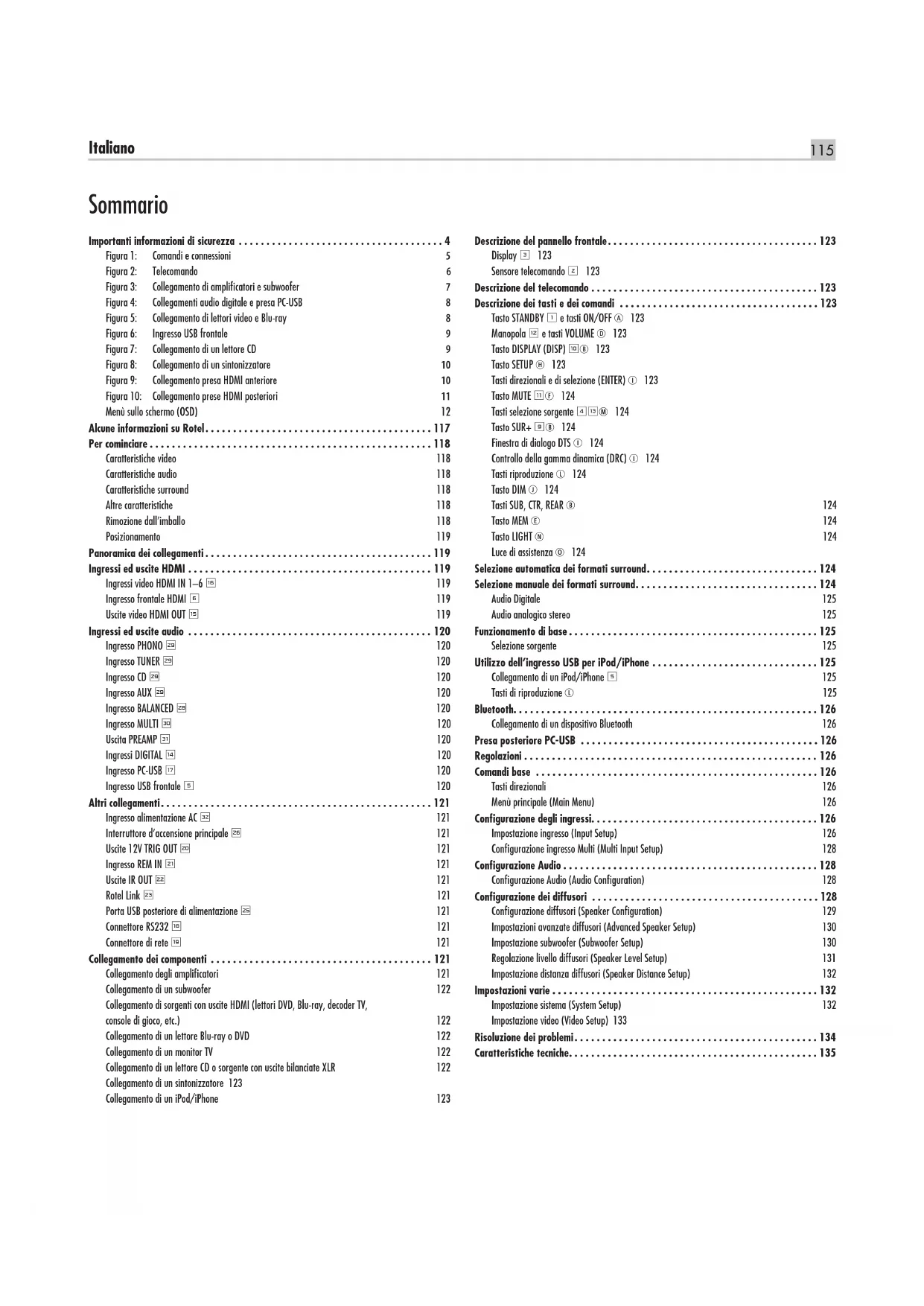 - Consultare il vostro rivenditore o un tecnico specializzato. Attenzione Questo dispositivo in conformità al regolamento FCC, Parte 15 è soggetto alle seguenti condizioni: (1)Questo apparecchio non dovrebbe causare interferenze nocive, e (2) deve poter sopportare interferenze provenienti da altri apparecchi, che potrebbero incidere anche sul suo funzionamento.118 RSP-1576MKII Processore Surround Alcune informazioni su Rotel La nostra storia ha avuto inizio 50 anni fa. Nel corso del tempo abbiamo ricevuto centinaia di riconoscimenti per la qualità dei nostri prodotti e soddisfatto centinaia di migliaia di audioli ed amanti della musica. Proprio come voi! Rotel è stata fondata da una famiglia la cui passione per la musica ha portato alla realizzazione di componenti alta fedeltà di qualità senza compromessi. Attraverso gli anni questa passione non si è afevolita e l’obbiettivo di realizzare apparecchi di straordinario valore per veri audioli, indipendentemente dal loro budget, continua ad essere condiviso da tutti coloro che vi lavorano. I nostri progettisti operano in stretto contatto tra loro ascoltando ed afnando ogni nuovo prodotto no a raggiungere determinati standard qualitativi. Viene loro offerta una totale libertà di scelta sui componenti per ottenere le migliori prestazioni possibili. Non è raro quindi trovare in un Rotel condensatori di fabbricazione inglese o tedesca, semiconduttori giapponesi o americani, con la sola eccezione dei trasformatori di alimentazione, prodotti come tradizione nelle nostre fabbriche. Noi tutti abbiamo a cuore i temi dell’ambiente. Pensando al numero sempre crescente di apparecchi elettronici prodotti, è molto importante per un costruttore fare tutto il possibile afnché essi abbiano un minimo impatto sull’ambiente. Alla Rotel siamo orgogliosi di fare la nostra parte riducendo il contenuto di piombo nei nostri apparecchi rispettando rigorosamente la normativa RoHS. I nostri progettisti sono continuamente impegnati a migliorare l’efcienza dei prodotti senza per questo compromettere la loro qualità. Quando in standby, gli apparecchi assorbono una minima quantità di corrente così da soddisfare i requisiti dei più rigorosi standard sul consumo energetico. Anche le fabbriche Rotel contribuiscono ad aiutare l’ambiente attraverso continui progressi dei metodi di costruzione per arrivare a processi produttivi sempre più rispettosi dell’ambiente. Noi tutti di Rotel vi ringraziamo per aver acquistato questo prodotto che, siamo sicuri, vi accompagnerà per molti anni di puro divertimento e soddisfazione. Dolby, Dolby Atmos, and the double-D symbol are registered trademarks of Dolby Laboratories Licensing Corporation. Manufactured under license from Dolby Laboratories. Condential unpublished works. Copyright © 2012-2020 Dolby Laboratories. All rights reserved. For DTS patents, see http://patents.dts.com. Manufactured under license from DTS Inc. (for companies headquartered in the U.S./Japan/Taiwan) or under License from DTS Licensing Limited (for all other companies). DTS, DTS:X, and the DTS:X logo are registered trademarks or trademarks of DTS, Inc. in the United States and other countries. © 2020 DTS, Inc. ALL RIGHTS RESERVED. Per cominciare Grazie per aver acquistato il processore surround Rotel RSP-1576MKII. Questo apparecchio è un completo sistema di controllo audio/video per sorgenti analogiche e digitali, in grado di elaborare segnali digitali in una ampia gamma di formati, inclusi Dolby