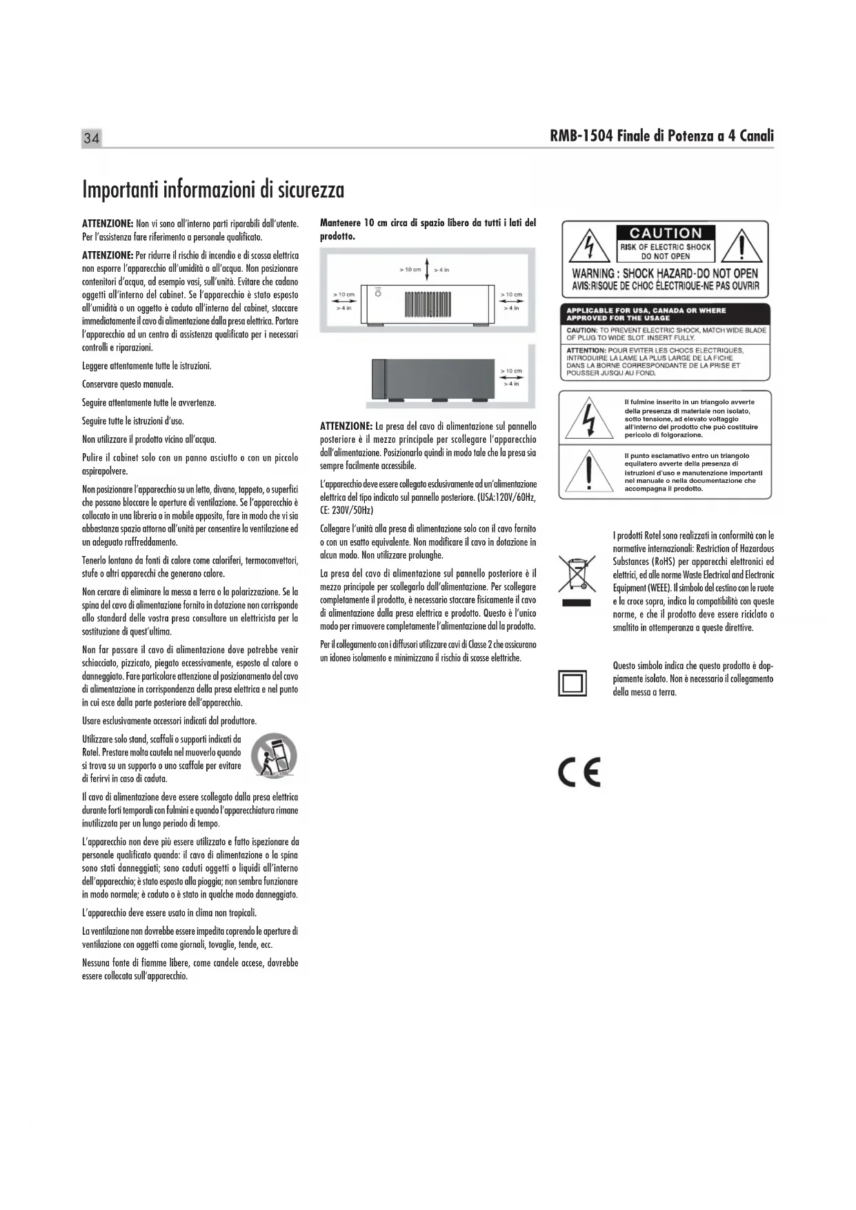 /9 ins Gewicht (netto) 14,9 kg Alle specificaties zijn correct bij het ter perse gaan. Rotel behoudt zich het recht voor zonder voorafgaande kennisgeving verbeteringen door te voeren. Rotel en het Rotel HiFi-logo zijn gedeponeerde handelsmerken van The Rotel Co, Ltd., Tokio, Japan.34 RMB-1504 Finale di Potenza a 4 Canali ATTENZIONE: Non vi sono all’interno parti riparabili dall’utente. Per l’assistenza fare riferimento a personale qualificato. ATTENZIONE: Per ridurre il rischio di incendio e di scossa elettrica non esporre l’apparecchio all’umidità o all’acqua. Non posizionare contenitori d’acqua, ad esempio vasi, sull’unità. Evitare che cadano oggetti all’interno del cabinet. Se l’apparecchio è stato esposto all’umidità o un oggetto è caduto all’interno del cabinet, staccare immediatamente il cavo di alimentazione dalla presa elettrica. Portare l’apparecchio ad un centro di assistenza qualificato per i necessari controlli e riparazioni. Leggere attentamente tutte le istruzioni. Conservare questo manuale. Seguire attentamente tutte le avvertenze. Seguire tutte le istruzioni d’uso. Non utilizzare il prodotto vicino all’acqua. Pulire il cabinet solo con un panno asciutto o con un piccolo aspirapolvere. Non posizionare l’apparecchio su un letto, divano, tappeto, o superfici che possano bloccare le aperture di ventilazione. Se l’apparecchio è collocato in una libreria o in mobile apposito, fare in modo che vi sia abbastanza spazio attorno all’unità per consentire la ventilazione ed un adeguato raffreddamento. Tenerlo lontano da fonti di calore come caloriferi, termoconvettori, stufe o altri apparecchi che generano calore. Non cercare di eliminare la messa a terra o la polarizzazione. Se la spina del cavo di alimentazione fornito in dotazione non corrisponde allo standard delle vostra presa consultare un elettricista per la sostituzione di quest’ultima. Non far passare il cavo di alimentazione dove potrebbe venir schiacciato, pizzicato, piegato eccessivamente, esposto al calore o danneggiato. Fare particolare attenzione al posizionamento del cavo di alimentazione in corrispondenza della presa elettrica e nel punto in cui esce dalla parte posteriore dell’apparecchio. Usare esclusivamente accessori indicati dal produttore. Utilizzare solo stand, scaffali o supporti indicati da Rotel. Prestare molta cautela nel muoverlo quando si trova su un supporto o uno scaffale per evitare di ferirvi in caso di caduta. Il cavo di alimentazione deve essere scollegato dalla presa elettrica durante forti temporali con fulmini e quando l’apparecchiatura rimane inutilizzata per un lungo periodo di tempo. L’apparecchio non deve più essere utilizzato e fatto ispezionare da personale qualificato quando: il cavo di alimentazione o la spina sono stati danneggiati; sono caduti oggetti o liquidi all’interno dell’apparecchio; è stato esposto alla pioggia; non sembra funzionare in modo normale; è caduto o è stato in qualche modo danneggiato. L’apparecchio deve essere usato in clima non tropicali. La ventilazione non dovrebbe essere impedita coprendo le aperture di ventilazione con oggetti come giornali, tovaglie, tende, ecc. Nessuna fonte di fiamme libere, come candele accese, dovrebbe essere collocata sull’apparecchio. I prodotti Rotel sono realizzati in conformità con le normative internazionali: Restriction of Hazardous Substances (RoHS) per apparecchi elettronici ed elettrici, ed alle norme Waste Electrical and Electronic Equipment (WEEE). Il simbolo del cestino con le ruote e la croce sopra, indica la compatibilità con queste norme, e che il prodotto deve essere riciclato o smaltito in ottemperanza a queste direttive. Importanti informazioni di sicurezza Mantenere 10 cm circa di spazio libero da tutti i lati del prodotto. ATTENZIONE: La presa del cavo di alimentazione sul pannello posteriore è il mezzo principale per scollegare l’apparecchio dall’alimentazione. Posizionarlo quindi in modo tale che la presa sia sempre facilmente accessibile. L’apparecchio deve essere collegato esclusivamente ad un’alimentazione elettrica del tipo indicato sul pannello posteriore. (USA:120V/60Hz, CE: 230V/50Hz) Collegare l’unità alla presa di alimentazione solo con il cavo fornito o con un esatto equivalente. Non modificare il cavo in dotazione in alcun modo. Non utilizzare prolunghe. La presa del cavo di alimentazione sul pannello posteriore è il mezzo principale per scollegarlo dall’alimentazione. Per scollegare completamente il prodotto, è necessario staccare fisicamente il cavo di alimentazione dalla presa elettrica e prodotto. Questo è l’unico modo per rimuovere completamente l’alimentazione dal la prodotto. Per il collegamento con i diffusori utilizzare cavi di Classe 2 che assicurano un idoneo isolamento e minimizzano il rischio di scosse elettriche. Il fulmine inserito in un triangolo avverte della presenza di materiale non isolato, sotto tensione, ad elevato voltaggio all'interno del prodotto che può costituire pericolo di folgorazione. Il punto esclamativo entro un triangolo equilatero avverte della presenza di istruzioni d’uso e manutenzione importanti nel manuale o nella documentazione che accompagna il prodotto. Questo simbolo indica che questo prodotto è dop- piamente isolato. Non è necessario il collegamento della messa a terra.35 Italiano Alcune informazioni su Rotel La nostra storia ha avuto inizio quasi 50 anni fa. Nel corso del tempo abbiamo ricevuto centinaia di riconoscimenti per la qualità dei nostri prodotti e soddisfatto centinaia di migliaia di audioli ed amanti della musica. Proprio come voi! Rotel è stata fondata da una famiglia la cui passione per la musica ha portato alla realizzazione di componenti alta fedeltà di qualità senza compromessi. Attraverso gli anni questa passione non si è afevolita e l’obbiettivo di realizzare apparecchi di straordinario valore per veri audioli, indipendentemente dal loro budget, 