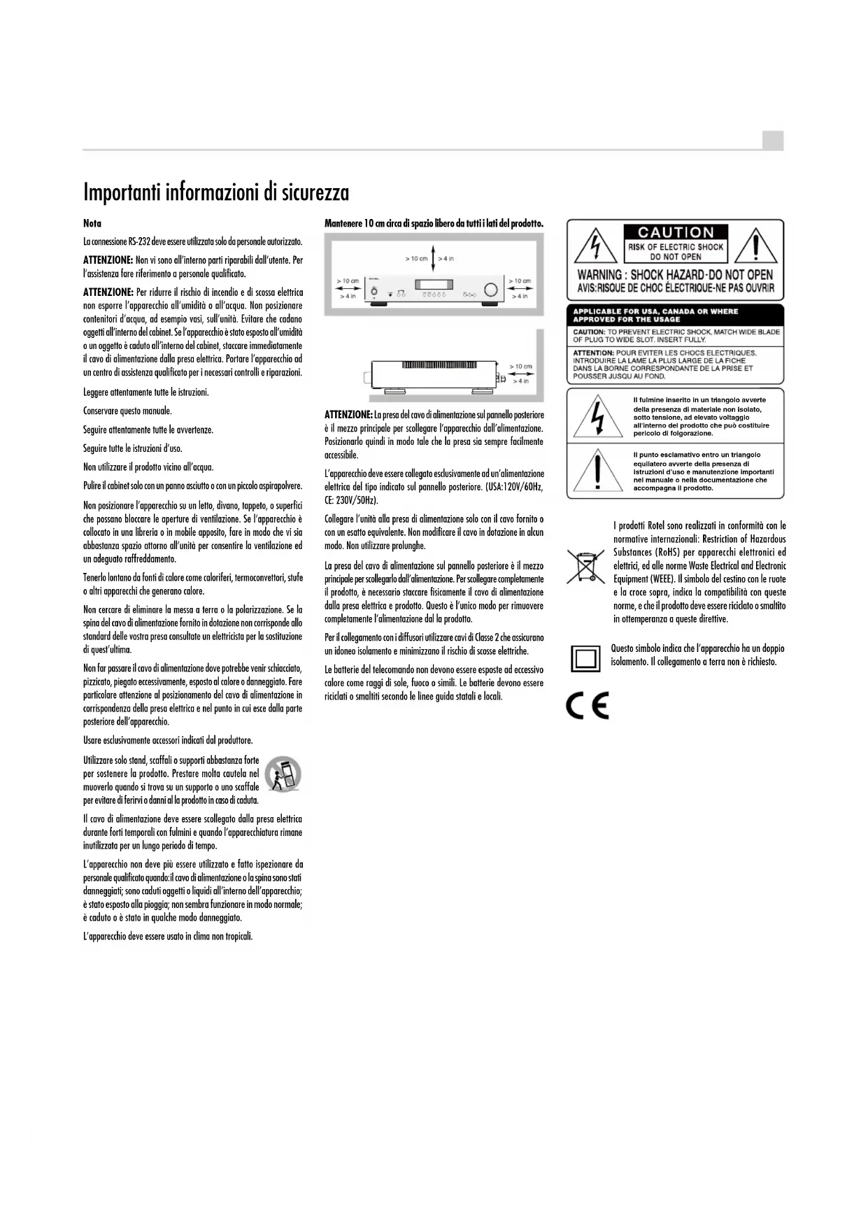 - Gewicht (netto) 6,85 kg Alle specificaties zijn correct bij het ter perse gaan. Rotel behoudt zich het recht voor zonder voorafgaande kennisgeving verbeteringen door te voeren. Rotel en het Rotel Hi-Fi-logo zijn gedeponeerde handelsmerken van The Rotel Co, Ltd., Tokio, Japan.PB 49 A11 Amplicatore integrato stereo Nota La connessione RS-232 deve essere utilizzata solo da personale autorizzato. ATTENZIONE: Non vi sono all’interno parti riparabili dall’utente. Per l’assistenza fare riferimento a personale qualificato. ATTENZIONE: Per ridurre il rischio di incendio e di scossa elettrica non esporre l’apparecchio all’umidità o all’acqua. Non posizionare contenitori d’acqua, ad esempio vasi, sull’unità. Evitare che cadano oggetti all’interno del cabinet. Se l’apparecchio è stato esposto all’umidità o un oggetto è caduto all’interno del cabinet, staccare immediatamente il cavo di alimentazione dalla presa elettrica. Portare l’apparecchio ad un centro di assistenza qualificato per i necessari controlli e riparazioni. Leggere attentamente tutte le istruzioni. Conservare questo manuale. Seguire attentamente tutte le avvertenze. Seguire tutte le istruzioni d’uso. Non utilizzare il prodotto vicino all’acqua. Pulire il cabinet solo con un panno asciutto o con un piccolo aspirapolvere. Non posizionare l’apparecchio su un letto, divano, tappeto, o superfici che possano bloccare le aperture di ventilazione. Se l’apparecchio è collocato in una libreria o in mobile apposito, fare in modo che vi sia abbastanza spazio attorno all’unità per consentire la ventilazione ed un adeguato raffreddamento. Tenerlo lontano da fonti di calore come caloriferi, termoconvettori, stufe o altri apparecchi che generano calore. Non cercare di eliminare la messa a terra o la polarizzazione. Se la spina del cavo di alimentazione fornito in dotazione non corrisponde allo standard delle vostra presa consultate un elettricista per la sostituzione di quest’ultima. Non far passare il cavo di alimentazione dove potrebbe venir schiacciato, pizzicato, piegato eccessivamente, esposto al calore o danneggiato. Fare particolare attenzione al posizionamento del cavo di alimentazione in corrispondenza della presa elettrica e nel punto in cui esce dalla parte posteriore dell’apparecchio. Usare esclusivamente accessori indicati dal produttore. Utilizzare solo stand, scaffali o supporti abbastanza forte per sostenere la prodotto. Prestare molta cautela nel muoverlo quando si trova su un supporto o uno scaffale per evitare di ferirvi o danni al la prodotto in caso di caduta. Il cavo di alimentazione deve essere scollegato dalla presa elettrica durante forti temporali con fulmini e quando l’apparecchiatura rimane inutilizzata per un lungo periodo di tempo. L’apparecchio non deve più essere utilizzato e fatto ispezionare da personale qualificato quando: il cavo di alimentazione o la spina sono stati danneggiati; sono caduti oggetti o liquidi all’interno dell’apparecchio; è stato esposto alla pioggia; non sembra funzionare in modo normale; è caduto o è stato in qualche modo danneggiato. L’apparecchio deve essere usato in clima non tropicali. I prodotti Rotel sono realizzati in conformità con le normative internazionali: Restriction of Hazardous Substances (RoHS) per apparecchi elettronici ed elettrici, ed alle norme Waste Electrical and Electronic Equipment (WEEE). Il simbolo del cestino con le ruote e la croce sopra, indica la compatibilità con queste norme, e che il prodotto deve essere riciclato o smaltito in ottemperanza a queste direttive. Questo simbolo indica che l’apparecchio ha un doppio isolamento. Il collegamento a terra non è richiesto. Importanti informazioni di sicurezza Mantenere 10 cm circa di spazio libero da tutti i lati del prodotto. ATTENZIONE: La presa del cavo di alimentazione sul pannello posteriore è il mezzo principale per scollegare l’apparecchio dall’alimentazione. Posizionarlo quindi in modo tale che la presa sia sempre facilmente accessibile. L’apparecchio deve essere collegato esclusivamente ad un’alimentazione elettrica del tipo indicato sul pannello posteriore. (USA:120V/60Hz, CE: 230V/50Hz). Collegare l’unità alla presa di alimentazione solo con il cavo fornito o con un esatto equivalente. Non modificare il cavo in dotazione in alcun modo. Non utilizzare prolunghe. La presa del cavo di alimentazione sul pannello posteriore è il mezzo principale per scollegarlo dall’alimentazione. Per scollegare completamente il prodotto, è necessario staccare fisicamente il cavo di alimentazione dalla presa elettrica e prodotto. Questo è l’unico modo per rimuovere completamente l’alimentazione dal la prodotto. Per il collegamento con i diffusori utilizzare cavi di Classe 2 che assicurano un idoneo isolamento e minimizzano il rischio di scosse elettriche. Le batterie del telecomando non devono essere esposte ad eccessivo calore come raggi di sole, fuoco o simili. Le batterie devono essere riciclati o smaltiti secondo le linee guida statali e locali. Il fulmine inserito in un triangolo avverte della presenza di materiale non isolato, sotto tensione, ad elevato voltaggio all'interno del prodotto che può costituire pericolo di folgorazione. Il punto esclamativo entro un triangolo equilatero avverte della presenza di istruzioni d’uso e manutenzione importanti nel manuale o nella documentazione che accompagna il prodotto.50 A11 Amplicatore integrato stereo Alcune informazioni su Rotel La nostra storia ha avuto inizio quasi 50 anni fa. Nel corso del tempo abbiamo ricevuto centinaia di riconoscimenti per la qualità dei nostri prodotti e soddisfatto centinaia di migliaia di audioli ed amanti della musica. Proprio come voi! Rotel è stata fondata da una famiglia la cui passione per la musica ha portato alla realizzazione di componenti alta fedeltà di qualità senza compromessi. Attraverso gli anni questa passione non si è affievolita e l’obbiettiv