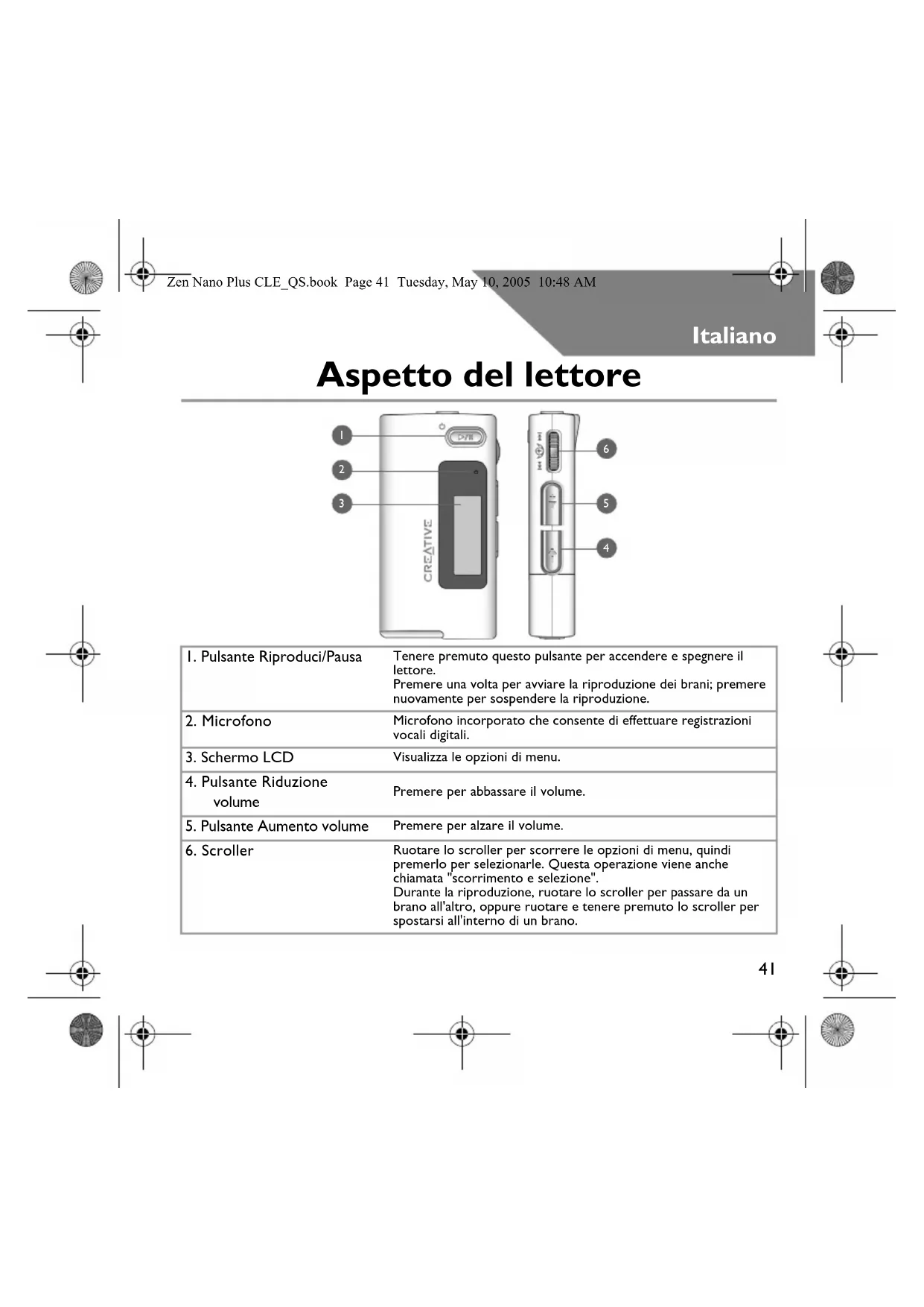 Zen Nano Plus CLE_QS.book Page 41 Tuesday, May 10, 2005 10:48 AM42 Utilizzo dello scroller È possibile utilizzare lo scroller per selezionare le opzioni di menu. L'espressione "Scorrere e selezionare" viene usata per indicare l'utilizzo dello scroller per scorrere le opzioni di menu e selezionarle tramite la pressione dello scroller.