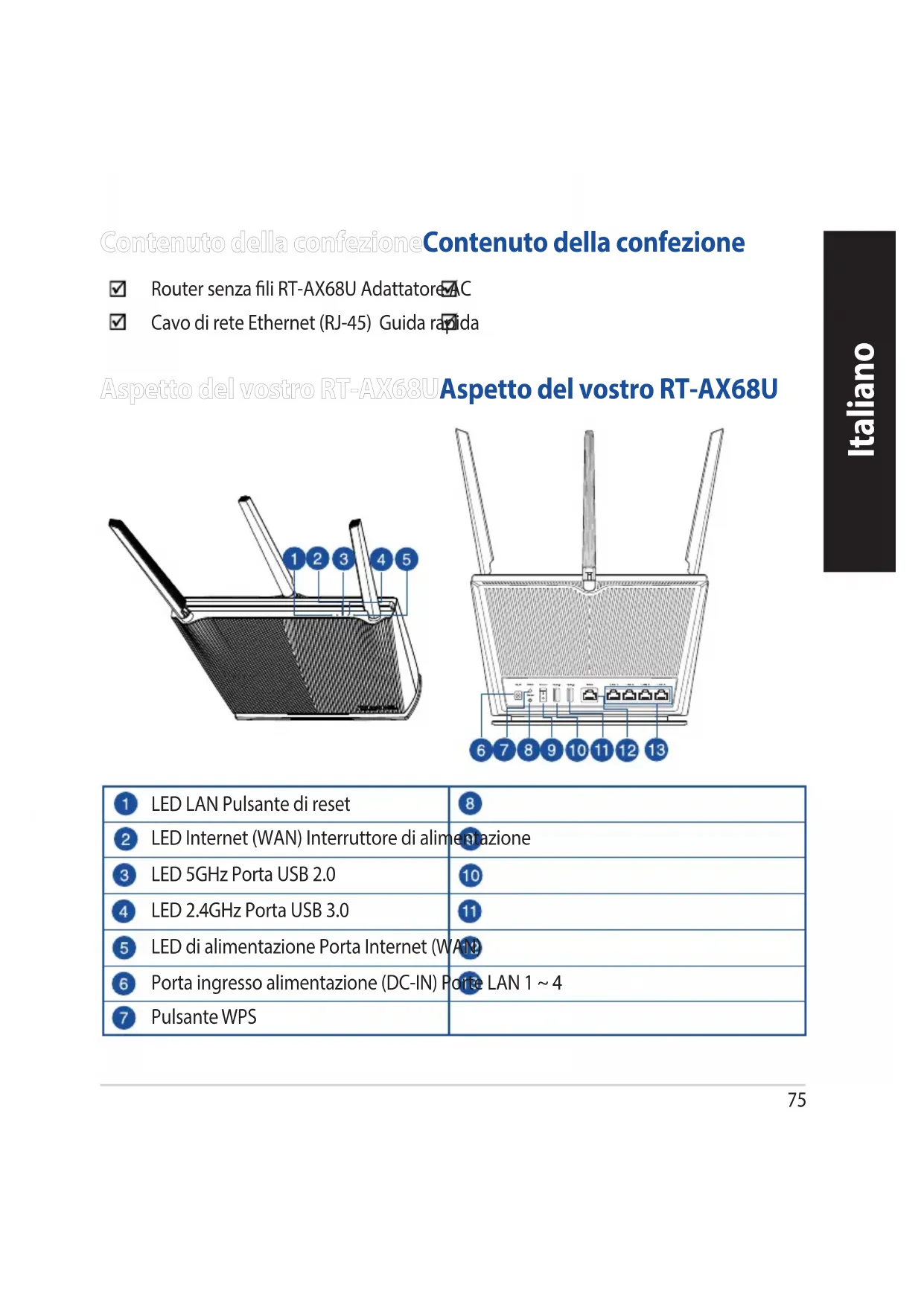 - A felhasználói útmutató online verziója a https://www.asus.com/support címen érhető el ASUS Router ASUS Router75 Italiano Aspetto del vostro RT-AX68UAspetto del vostro RT-AX68U LED LAN Pulsante di reset LED Internet (WAN) Interruttore di alimentazione LED 5GHz Porta USB 2.0 LED 2.4GHz Porta USB 3.0 LED di alimentazione Porta Internet (WAN) Porta ingresso alimentazione (DC-IN) Porte LAN 1 ~ 4 Pulsante WPS Contenuto della confezioneContenuto della confezione Router senza li RT-AX68U Adattatore AC Cavo di rete Ethernet (RJ-45) Guida rapida Italiano76 Italiano Posizionamento del vostro router wirelessPosizionamento del vostro router wireless Per ottenere una migliore trasmissione del segnale tra il router wireless e i dispositivi di rete connessi assicuratevi di:
