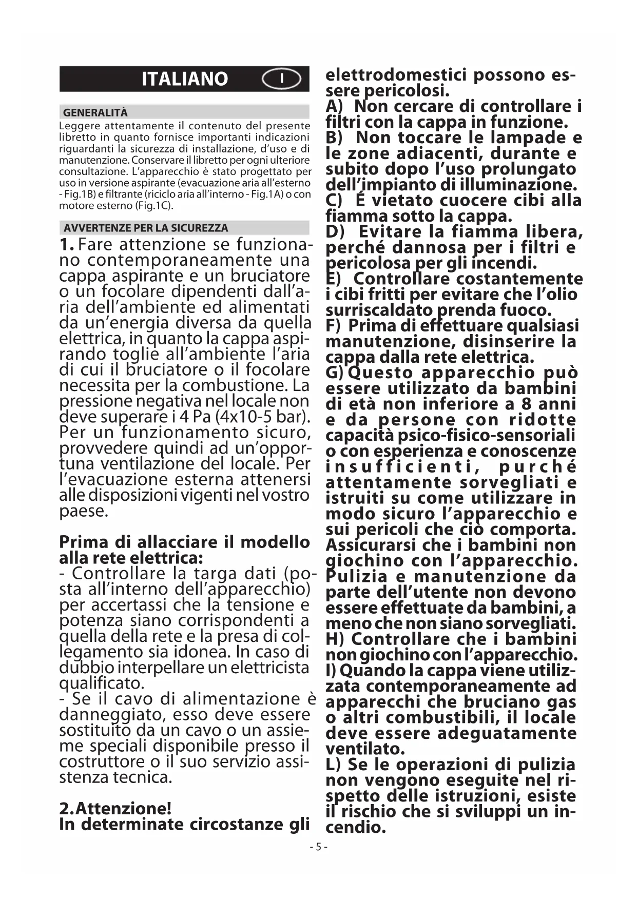 In determinate circostanze gli elettrodomestici possono es- sere pericolosi. A) Non cercare di controllare i filtri con la cappa in funzione. B) Non toccare le lampade e le zone adiacenti, durante e subito dopo l’uso prolungato dell’impianto di illuminazione. C) É vietato cuocere cibi alla fiamma sotto la cappa. D) Evitare la fiamma libera, perché dannosa per i filtri e pericolosa per gli incendi. E) Controllare costantemente i cibi fritti per evitare che l’olio surriscaldato prenda fuoco. F) Prima di effettuare qualsiasi manutenzione, disinserire la cappa dalla rete elettrica. G) Questo apparecchio può essere utilizzato da bambini di età non inferiore a 8 anni e da persone con ridotte capacità psico-fisico-sensoriali o con esperienza e conoscenze insufficienti, purché attentamente sorvegliati e istruiti su come utilizzare in modo sicuro l’apparecchio e sui pericoli che ciò comporta. Assicurarsi che i bambini non giochino con l’apparecchio. Pulizia e manutenzione da parte dell’utente non devono essere effettuate da bambini, a meno che non siano sorvegliati. H) Controllare che i bambini non giochino con l’apparecchio.