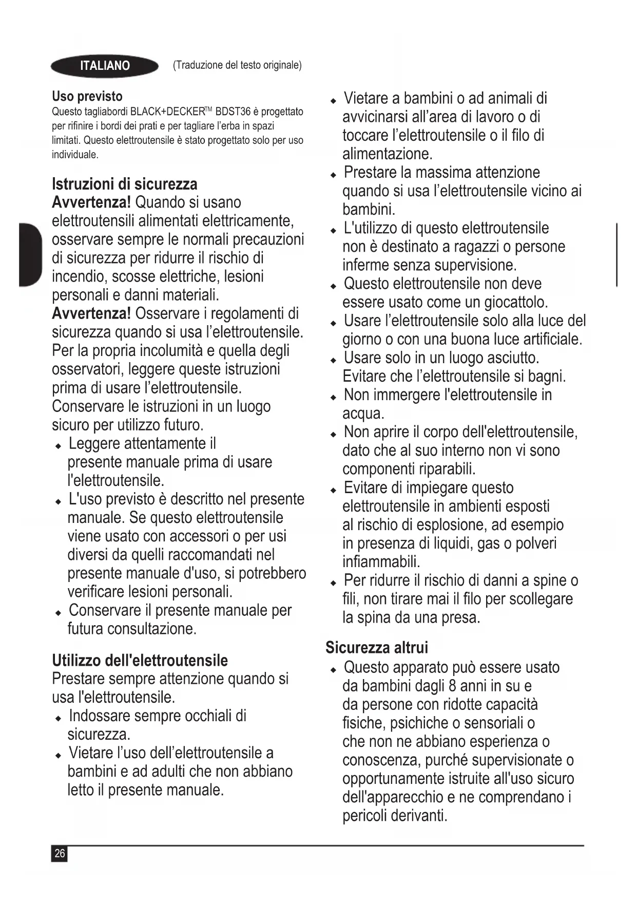 BDST36 è progettato per rinire i bordi dei prati e per tagliare l’erba in spazi limitati. Questo elettroutensile è stato progettato solo per uso individuale. Istruzioni di sicurezza Avvertenza! Quando si usano elettroutensili alimentati elettricamente, osservare sempre le normali precauzioni di sicurezza per ridurre il rischio di incendio, scosse elettriche, lesioni personali e danni materiali. Avvertenza! Osservare i regolamenti di sicurezza quando si usa l’elettroutensile. Per la propria incolumità e quella degli osservatori, leggere queste istruzioni prima di usare l’elettroutensile. Conservare le istruzioni in un luogo sicuro per utilizzo futuro. uLeggere attentamente il presente manuale prima di usare l'elettroutensile. uL'uso previsto è descritto nel presente manuale. Se questo elettroutensile viene usato con accessori o per usi diversi da quelli raccomandati nel presente manuale d'uso, si potrebbero vericare lesioni personali. uConservare il presente manuale per futura consultazione. Utilizzo dell'elettroutensile Prestare sempre attenzione quando si usa l'elettroutensile. uIndossare sempre occhiali di sicurezza. uVietare l’uso dell’elettroutensile a bambini e ad adulti che non abbiano letto il presente manuale. uVietare a bambini o ad animali di avvicinarsi all’area di lavoro o di toccare l’elettroutensile o il lo di alimentazione. uPrestare la massima attenzione quando si usa l’elettroutensile vicino ai bambini. uL'utilizzo di questo elettroutensile non è destinato a ragazzi o persone inferme senza supervisione. uQuesto elettroutensile non deve essere usato come un giocattolo. uUsare l’elettroutensile solo alla luce del giorno o con una buona luce articiale. uUsare solo in un luogo asciutto. Evitare che l’elettroutensile si bagni. uNon immergere l'elettroutensile in acqua. uNon aprire il corpo dell'elettroutensile, dato che al suo interno non vi sono componenti riparabili. uEvitare di impiegare questo elettroutensile in ambienti esposti al rischio di esplosione, ad esempio in presenza di liquidi, gas o polveri inammabili. uPer ridurre il rischio di danni a spine o li, non tirare mai il lo per scollegare la spina da una presa. Sicurezza altrui uQuesto apparato può essere usato da bambini dagli 8 anni in su e da persone con ridotte capacità siche, psichiche o sensoriali o che non ne abbiano esperienza o conoscenza, purché supervisionate o opportunamente istruite all'uso sicuro dell'apparecchio e ne comprendano i pericoli derivanti.27 (Traduzione del testo originale) ITALIANO uI bambini non devono giocare con l'elettrodomestico. Gli interventi di pulizia e di manutenzione da parte dell'utente non devono essere eseguiti da bambini senza supervisione. Rischi residui. Quando si usa l'elettroutensile, possono esservi altri rischi residui che possono non essere stati contemplati negli avvisi di sicurezza allegati. Tali rischi possono sorgere a seguito di un uso prolungato o improprio, ecc. Perno adottando gli appositi regolamenti di sicurezza e utilizzando i dispositivi di sicurezza, certi rischi residui non possono essere evitati. Essi comprendono: uLesioni causate o subite a seguito del contatto con parti rotanti/in movimento. uLesioni causate o subite durante la sostituzione di parti, lame o accessori. uLesioni causate dall’impiego prolungato di un elettroutensile. Quando si usa qualsiasi elettroutensile per lunghi periodi, accertarsi di fare regolarmente delle pause. uProblemi di udito. uRischi per la salute causati dall’aspirazione di polvere generata dall’utilizzo dell’elettroutensile (ad esempio quando si lavora con il legno, in modo particolare quello di quercia, faggio o l’MDF.) Dopo l'impiego uQuando non viene usato, l’elettroutensile deve essere conservato in un luogo asciutto e ben ventilato, fuori dalla portata dei bambini. uGli elettroutensili non devono essere riposti alla portata dei bambini. uSe viene conservato o trasportato in un veicolo, l’elettroutensile deve essere messo nel bagagliaio o legato per evitare che si sposti in caso di cambiamento repentino della velocità o della direzione di marcia. Ispezione e riparazioni uPrima dell'impiego, controllare che l'elettroutensile non sia danneggiato e non presenti parti difettose. Controllare che non vi siano parti rotte o altre condizioni che potrebbero avere ripercussioni sulle prestazioni. uNon usare l'elettroutensile se alcune parti sono danneggiate o difettose. uFar riparare o sostituire le parti danneggiate o difettose da un tecnico autorizzato. uNon tentare di smontare o sostituire qualsiasi parte ad eccezione di quelle specicate nel presente manuale. Utilizzo di un cavo di prolunga Usare sempre un cavo di prolunga di tipo omologato, idoneo all’assorbimento di corrente di questo elettroutensile (vedere i dati tecnici). Il cavo di prolunga deve essere idoneo per impiego all’esterno e deve essere opportunamente contrassegnato. È possibile usare un cavo di prolunga lungo no a 30 m con diametro di 1,5 mm² HO5VV-F senza perdita alcuna delle prestazioni del prodotto. Prima dell’impiego, ispezionare il cavo di prolunga per accertarsi che non presenti segni di danni, usura o invecchiamento. Sostituire il cavo di28 (Traduzione del testo originale) ITALIANO prolunga se è danneggiato o difettoso. Se si usa un mulinello, svolgere sempre completamente il cavo. Altre precauzioni di sicurezza per i decespugliatori tagliabordi Attenzione! I li da taglio continuano a girare dopo lo spegnimento del motore. uImparare bene i comandi e come usare in modo appropriato l’elettroutensile. uPrima dell’uso, controllare che il lo di alimentazione e il cavo di prolunga non presentino segni di danni, invecchiamento e usura. Se il lo di alimentazione subisce danni durante l’uso, scollegarlo immediatamente dalla presa di corrente. NON TOCCARE IL FILO DI