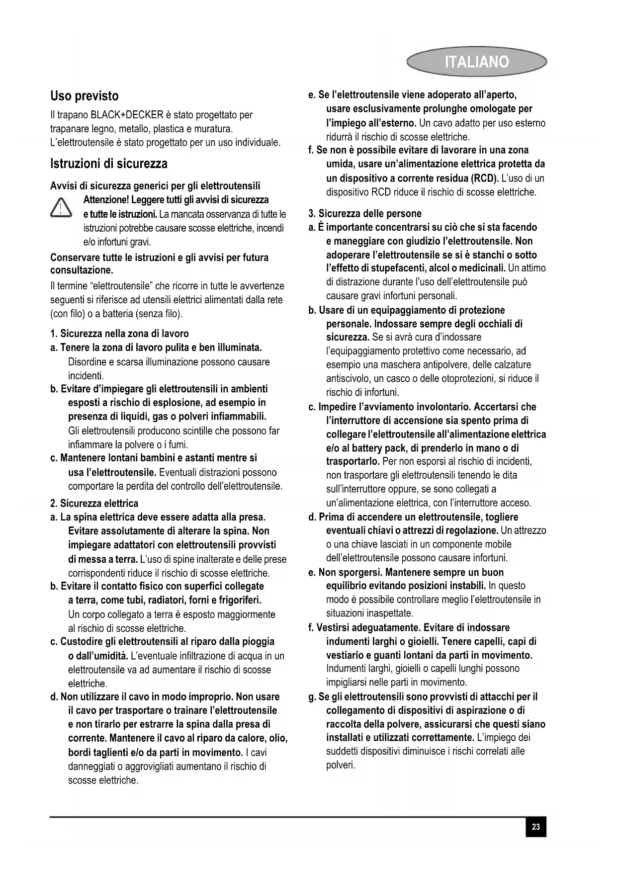 ♦23 ITALIANO ITALIAN O Uso previsto Il trapano BLACK+DECKER è stato progettato per trapanare legno, metallo, plastica e muratura. L’elettroutensile è stato progettato per un uso individuale. Istruzioni di sicurezza Avvisi di sicurezza generici per gli elettroutensili Attenzione! Leggere tutti gli avvisi di sicurezza e tutte le istruzioni. La mancata osservanza di tutte le istruzioni potrebbe causare scosse elettriche, incendi e/o infortuni gravi. Conservare tutte le istruzioni e gli avvisi per futura consultazione. Il termine “elettroutensile” che ricorre in tutte le avvertenze seguenti si riferisce ad utensili elettrici alimentati dalla rete (con filo) o a batteria (senza filo).