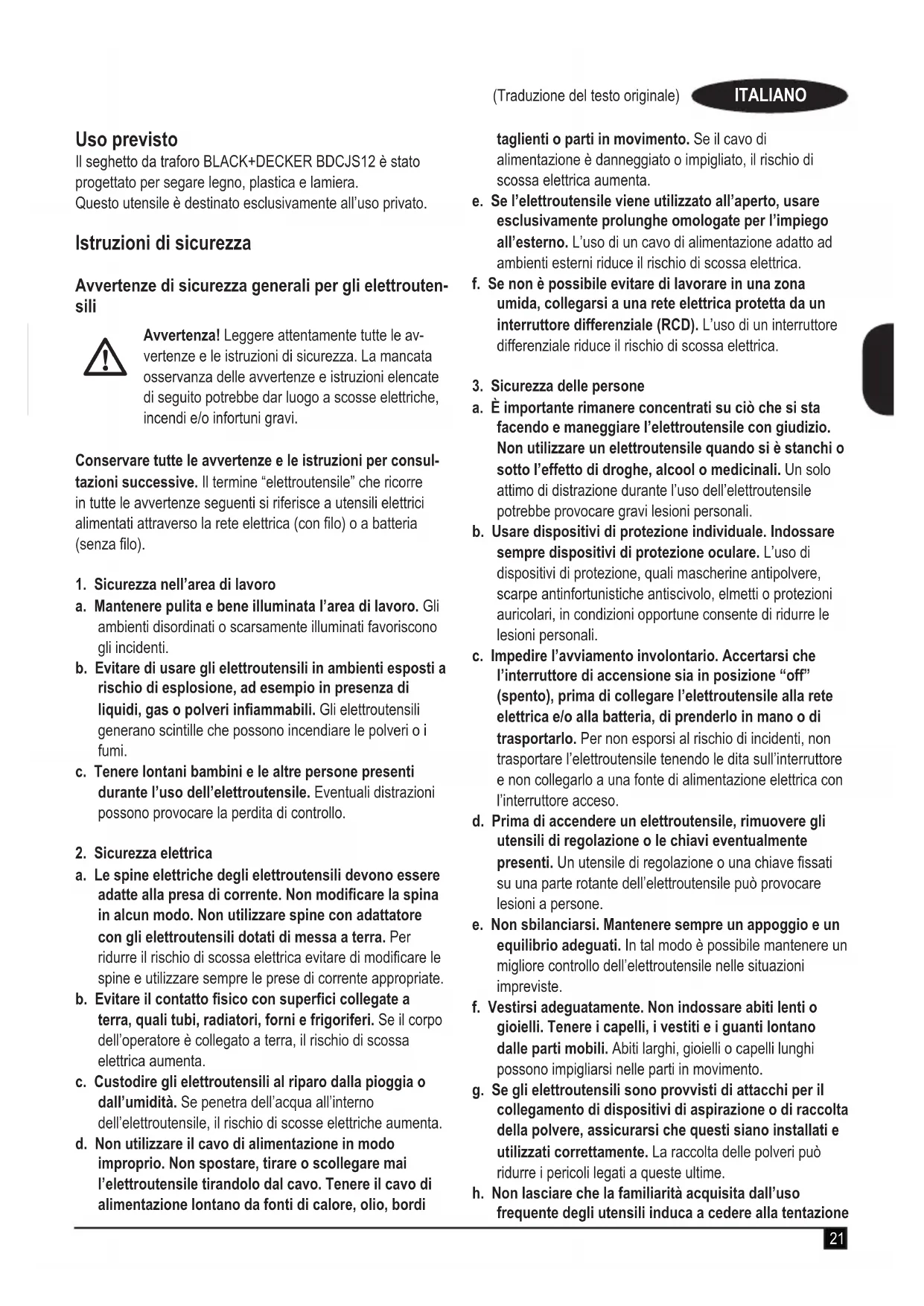 Scarica le istruzioni per il tuo Sega in formato PDF gratuitamente! Trova il tuo manuale BDCJS12N - BLACK & DECKER e riprendi in mano il tuo dispositivo elettronico. In questa pagina sono pubblicati tutti i documenti necessari per l'utilizzo del tuo dispositivo. BDCJS12N del marchio BLACK & DECKER.