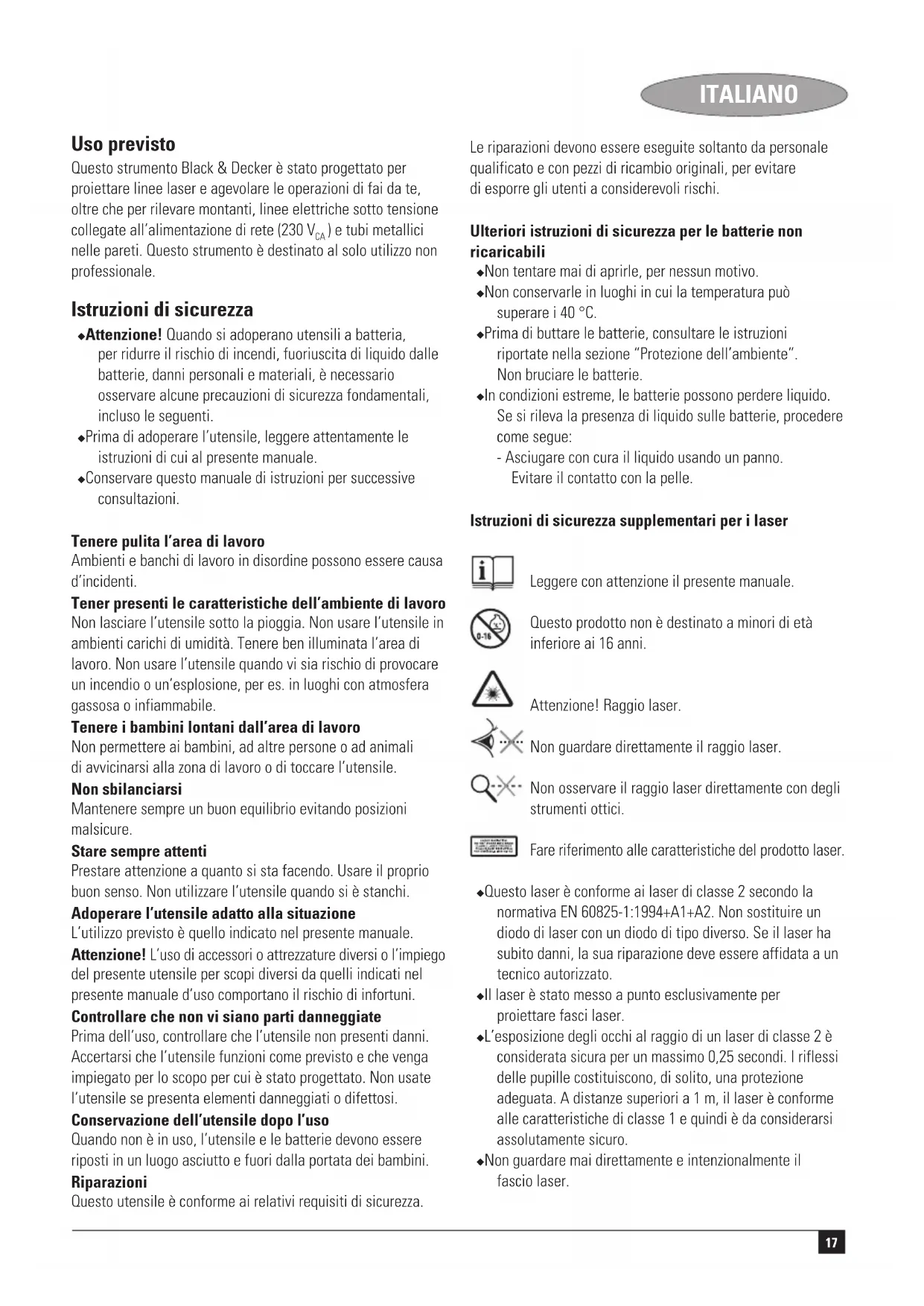 ) e tubi metallici nelle pareti. Questo strumento è destinato al solo utilizzo non professionale. Istruzioni di sicurezza ◆ Attenzione! Quando si adoperano utensili a batteria, per ridurre il rischio di incendi, fuoriuscita di liquido dalle batterie, danni personali e materiali, è necessario osservare alcune precauzioni di sicurezza fondamentali, incluso le seguenti. ◆ Prima di adoperare l’utensile, leggere attentamente le istruzioni di cui al presente manuale. ◆ Conservare questo manuale di istruzioni per successive consultazioni. Tenere pulita l’area di lavoro Ambienti e banchi di lavoro in disordine possono essere causa d’incidenti. Tener presenti le caratteristiche dell’ambiente di lavoro Non lasciare l’utensile sotto la pioggia. Non usare l’utensile in ambienti carichi di umidità. Tenere ben illuminata l’area di lavoro. Non usare l’utensile quando vi sia rischio di provocare un incendio o un’esplosione, per es. in luoghi con atmosfera gassosa o infiammabile. Tenere i bambini lontani dall’area di lavoro Non permettere ai bambini, ad altre persone o ad animali di avvicinarsi alla zona di lavoro o di toccare l’utensile. Non sbilanciarsi Mantenere sempre un buon equilibrio evitando posizioni malsicure. Stare sempre attenti Prestare attenzione a quanto si sta facendo. Usare il proprio buon senso. Non utilizzare l’utensile quando si è stanchi. Adoperare l’utensile adatto alla situazione L’utilizzo previsto è quello indicato nel presente manuale. Attenzione! L’uso di accessori o attrezzature diversi o l’impiego del presente utensile per scopi diversi da quelli indicati nel presente manuale d’uso comportano il rischio di infortuni. Controllare che non vi siano parti danneggiate Prima dell’uso, controllare che l’utensile non presenti danni. Accertarsi che l’utensile funzioni come previsto e che venga impiegato per lo scopo per cui è stato progettato. Non usate l’utensile se presenta elementi danneggiati o difettosi. Conservazione dell’utensile dopo l’uso Quando non è in uso, l’utensile e le batterie devono essere riposti in un luogo asciutto e fuori dalla portata dei bambini. Riparazioni Questo utensile è conforme ai relativi requisiti di sicurezza. Le riparazioni devono essere eseguite soltanto da personale qualificato e con pezzi di ricambio originali, per evitare di esporre gli utenti a considerevoli rischi. Ulteriori istruzioni di sicurezza per le batterie non ricaricabili ◆ Non tentare mai di aprirle, per nessun motivo. ◆ Non conservarle in luoghi in cui la temperatura può superare i 40 °C. ◆ Prima di buttare le batterie, consultare le istruzioni riportate nella sezione “Protezione dell’ambiente”. Non bruciare le batterie. ◆ In condizioni estreme, le batterie possono perdere liquido. Se si rileva la presenza di liquido sulle batterie, procedere come segue: - Asciugare con cura il liquido usando un panno. Evitare il contatto con la pelle. Istruzioni di sicurezza supplementari per i laser Leggere con attenzione il presente manuale. Questo prodotto non è destinato a minori di età inferiore ai 16 anni. Attenzione! Raggio laser. Non guardare direttamente il raggio laser. Non osservare il raggio laser direttamente con degli strumenti ottici. Fare riferimento alle caratteristiche del prodotto laser. ◆ Questo laser è conforme ai laser di classe 2 secondo la normativa EN 60825-1:1994+A1+A2. Non sostituire un diodo di laser con un diodo di tipo diverso. Se il laser ha subito danni, la sua riparazione deve essere affidata a un tecnico autorizzato. ◆ Il laser è stato messo a punto esclusivamente per proiettare fasci laser. ◆ L’esposizione degli occhi al raggio di un laser di classe 2 è considerata sicura per un massimo 0,25 secondi. I riflessi delle pupille costituiscono, di solito, una protezione adeguata. A distanze superiori a 1 m, il laser è conforme alle caratteristiche di classe 1 e quindi è da considerarsi assolutamente sicuro. ◆ Non guardare mai direttamente e intenzionalmente il fascio laser.18 ITALIANO ◆ Non usare strumenti ottici per guardare il fascio laser. ◆ Non mettere lo strumento in posizione tale da dirigere il fascio su altre persone, all’altezza della testa. ◆ Non consentire ai bambini di avvicinarsi. Istruzioni di sicurezza supplementari per rilevatori di montanti ◆ Notare che la presenza di tubi o linee elettriche vicino alla superficie della parete può portare lo strumento a identificarli come montanti. Ulteriori istruzioni di sicurezza per i rilevatori di tubi e cavi elettrici ◆ Non adoperare lo strumento per rilevare la presenza di tensione CA in conduttori esposti o liberi, privi di isolamento. ◆ Non utilizzare lo strumento come alternativa a un voltmetro. ◆ Lo strumento non sempre rileva correttamente tutti i tubi e i fili elettrici. Le condizioni seguenti possono determinare risultati imprecisi: – Pile scariche – Pareti spesse, con fili o tubi sottili – Pareti molto spesse – Tubi o fili installati in profondità – Pareti rivestite di metallo – Condizioni di elevata umidità – Cavi schermati ◆ Prima dell’uso, controllare sempre il funzionamento dello strumento rilevando un filo o un tubo la cui presenza sia già nota. ◆ In caso di dubbi, consultare un rivenditore qualificato. Attenzione! Questo strumento non rileva i fili dei circuiti isolati dall’alimentazione di rete, i cavi alimentati con corrente continua (c.c.) o i fili usati per le telecomunicazioni o i computer. I fili nascosti (ad esempio i fili della luce che corrono all’interno delle pareti) possono non essere rilevati quando gli interruttori sono spenti. Attenzione! Questo strumento individua esclusivamente tubi di metallo e di nessun altro materiale. Caratteristiche