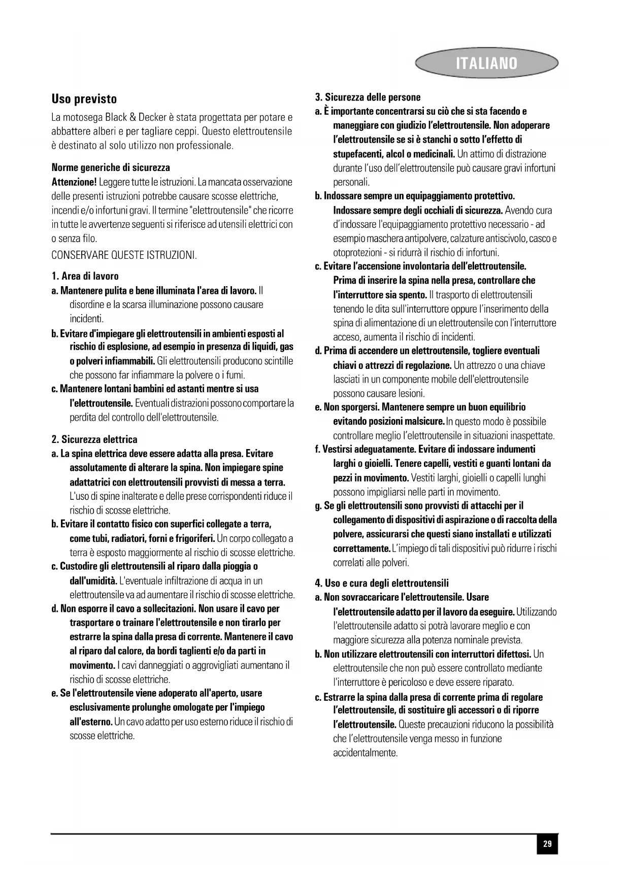 Poids (kg) 5,55 5,65 5,8 5,6 5,7 5,85 Classe de sécurité II II II II II II29 ITALIANO ITALIANO Uso previsto La motosega Black & Decker è stata progettata per potare e abbattere alberi e per tagliare ceppi. Questo elettroutensile è destinato al solo utilizzo non professionale. Norme generiche di sicurezza Attenzione! Leggere tutte le istruzioni. La mancata osservazione delle presenti istruzioni potrebbe causare scosse elettriche, incendi e/o infortuni gravi. Il termine "elettroutensile" che ricorre in tutte le avvertenze seguenti si riferisce ad utensili elettrici con o senza filo. CONSERVARE QUESTE ISTRUZIONI.
