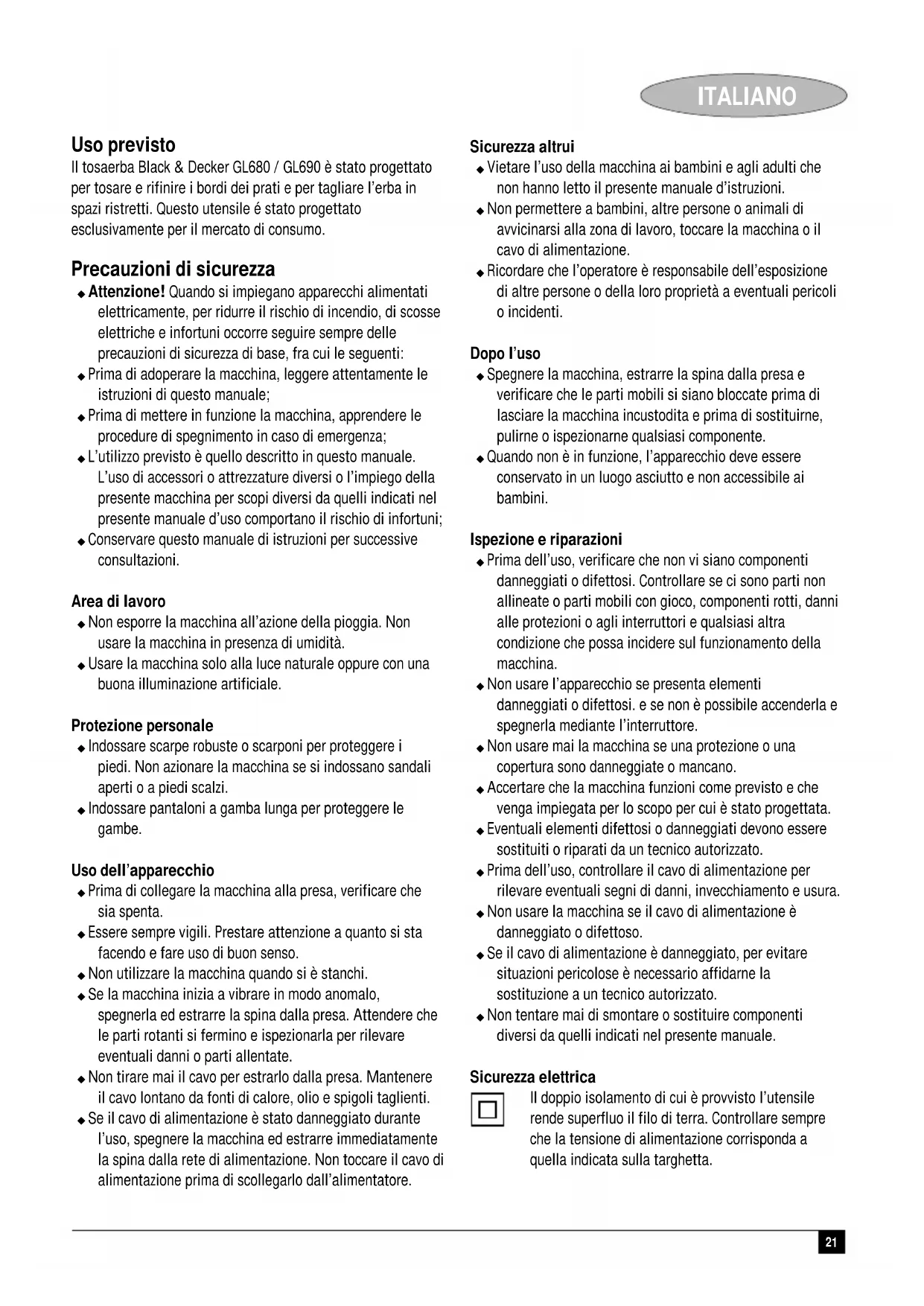 Kevin Hewitt Directeur Ingénierie Client Spennymoor, County Durham DL16 6JG, Royaume Uni 01-10-200220 FRANÇAIS Garantie Black & Decker est confiant dans la qualité de ses produits et vous offre une garantie très étendue. Ce certificat de garantie est un document supplémentaire et ne peut en aucun cas se substituer à vos droits légaux. La garantie est valable sur tout le territoire des Etats Membres de l’Union Européenne et de la Zone de Libre Echange Européenne. Si un produit Black & Decker s’avère défectueux en raison de matériaux en mauvaises conditions, d’une erreur humaine, ou d’un manque de conformité dans les 24 mois suivant la date d’achat, Black & Decker garantit le remplacement des pièces défectueuses, la réparation des produits usés ou cassés ou remplace ces produits à la convenance du client, sauf dans les circonstances suivantes : ◆ Le produit a été utilisé dans un but commercial, professionnel, ou a été loué. ◆ Le produit a été mal utilisé ou avec négligence. ◆ Le produit a subi des dommages à cause d’objets étrangers, de substances ou à cause d’accidents. ◆ Des réparations ont été tentées par des techniciens ne faisant pas partie du service technique de Black & Decker. Pour avoir recours à la garantie, il est nécessaire de fournir une preuve d’achat au vendeur ou à un réparateur agréé. Pour connaître l’adresse du réparateur agréé le plus proche de chez vous, contactez le bureau Black & Decker à l’adresse indiquée dans ce manuel. Vous pourrez aussi trouver une liste des réparateurs agréés de Black & Decker et de plus amples détails sur notre service après-vente sur le site Internet à l’adresse suivante : www.2helpU.com.21 ITALIANO Uso previsto Il tosaerba Black & Decker GL680 / GL690 è stato progettato per tosare e rifinire i bordi dei prati e per tagliare l’erba in spazi ristretti. Questo utensile é stato progettato esclusivamente per il mercato di consumo. Precauzioni di sicurezza ◆ Attenzione! Quando si impiegano apparecchi alimentati elettricamente, per ridurre il rischio di incendio, di scosse elettriche e infortuni occorre seguire sempre delle precauzioni di sicurezza di base, fra cui le seguenti: ◆ Prima di adoperare la macchina, leggere attentamente le istruzioni di questo manuale; ◆ Prima di mettere in funzione la macchina, apprendere le procedure di spegnimento in caso di emergenza; ◆ L’utilizzo previsto è quello descritto in questo manuale. L’uso di accessori o attrezzature diversi o l’impiego della presente macchina per scopi diversi da quelli indicati nel presente manuale d’uso comportano il rischio di infortuni; ◆ Conservare questo manuale di istruzioni per successive consultazioni. Area di lavoro ◆ Non esporre la macchina all’azione della pioggia. Non usare la macchina in presenza di umidità. ◆ Usare la macchina solo alla luce naturale oppure con una buona illuminazione artificiale. Protezione personale ◆ Indossare scarpe robuste o scarponi per proteggere i piedi. Non azionare la macchina se si indossano sandali aperti o a piedi scalzi. ◆ Indossare pantaloni a gamba lunga per proteggere le gambe. Uso dell’apparecchio ◆ Prima di collegare la macchina alla presa, verificare che sia spenta. ◆ Essere sempre vigili. Prestare attenzione a quanto si sta facendo e fare uso di buon senso. ◆ Non utilizzare la macchina quando si è stanchi. ◆ Se la macchina inizia a vibrare in modo anomalo, spegnerla ed estrarre la spina dalla presa. Attendere che le parti rotanti si fermino e ispezionarla per rilevare eventuali danni o parti allentate. ◆ Non tirare mai il cavo per estrarlo dalla presa. Mantenere il cavo lontano da fonti di calore, olio e spigoli taglienti. ◆ Se il cavo di alimentazione è stato danneggiato durante l’uso, spegnere la macchina ed estrarre immediatamente la spina dalla rete di alimentazione. Non toccare il cavo di alimentazione prima di scollegarlo dall’alimentatore. Sicurezza altrui ◆ Vietare l’uso della macchina ai bambini e agli adulti che non hanno letto il presente manuale d’istruzioni. ◆ Non permettere a bambini, altre persone o animali di avvicinarsi alla zona di lavoro, toccare la macchina o il cavo di alimentazione. ◆ Ricordare che l’operatore è responsabile dell’esposizione di altre persone o della loro proprietà a eventuali pericoli o incidenti. Dopo l’uso ◆ Spegnere la macchina, estrarre la spina dalla presa e verificare che le parti mobili si siano bloccate prima di lasciare la macchina incustodita e prima di sostituirne, pulirne o ispezionarne qualsiasi componente. ◆ Quando non è in funzione, l’apparecchio deve essere conservato in un luogo asciutto e non accessibile ai bambini. Ispezione e riparazioni ◆ Prima dell’uso, verificare che non vi siano componenti danneggiati o difettosi. Controllare se ci sono parti non allineate o parti mobili con gioco, componenti rotti, danni alle protezioni o agli interruttori e qualsiasi altra condizione che possa incidere sul funzionamento della macchina. ◆ Non usare l’apparecchio se presenta elementi danneggiati o difettosi. e se non è possibile accenderla e spegnerla mediante l’interruttore. ◆ Non usare mai la macchina se una protezione o una copertura sono danneggiate o mancano. ◆ Accertare che la macchina funzioni come previsto e che venga impiegata per lo scopo per cui è stato progettata. ◆ Eventuali elementi difettosi o danneggiati devono essere sostituiti o riparati da un tecnico autorizzato. ◆ Prima dell’uso, controllare il cavo di alimentazione per rilevare eventuali segni di danni, invecchiamento e usura. ◆ Non usare la macchina se il cavo di alimentazione è danneggiato o difettoso. ◆ Se il cavo di alimentazione è danneggiato, per evitare situazioni pericolose è necessario affidarne la sostituzione a un tecnico autorizzato. ◆ Non tentare mai di smontare o sostituire componenti diversi da quelli indicati nel p