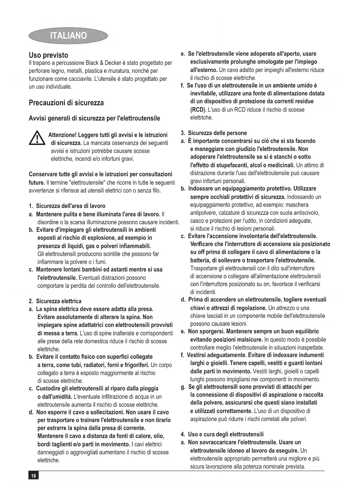 Attenzione! Per ridurre il rischio di lesioni, l'utente è tenuto a leggere il presente manuale di istruzioni. Sicurezza elettrica