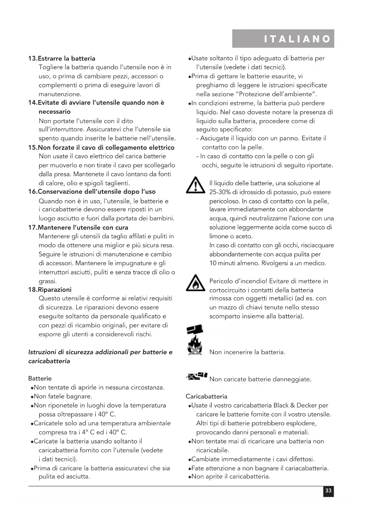 Simboli di sicurezza I seguenti simboli vengono usati nel presente manuale: Indica rischio di infortunio, pericolo di morte o danno all’apparecchio qualora non ci si attenga alle istruzioni contenute nel presente manuale. Indica pericolo di scossa elettrica. Leggere attentamente il manuale prima di utilizzare l’utensile. Pericolo d’incendio.loading-circle-133 ITALIANO 13.Estrarre la batteria Togliere la batteria quando l’utensile non è in uso, o prima di cambiare pezzi, accessori o complementi o prima di eseguire lavori di manutenzione. 14.Evitate di avviare l’utensile quando non è necessario Non portate l’utensile con il dito sull’interruttore. Assicuratevi che l’utensile sia spento quando inserite le batterie nell’utensile. 15.Non forzate il cavo di collegamento elettrico Non usate il cavo elettrico del carica batterie per muoverlo e non tirate il cavo per scollegarlo dalla presa. Mantenete il cavo lontano da fonti di calore, olio e spigoli taglienti. 16.Conservazione dell’utensile dopo l’uso Quando non è in uso, l’utensile, le batterie e i caricabatterie devono essere riposti in un luogo asciutto e fuori dalla portata dei bambini. 17.Mantenere l’utensile con cura Mantenere gli utensili da taglio affilati e puliti in modo da ottenere una miglior e più sicura resa. Seguire le istruzioni di manutenzione e cambio di accessori. Mantenere le impugnature e gli interruttori asciutti, puliti e senza tracce di olio o grassi. 18.Riparazioni Questo utensile è conforme ai relativi requisiti di sicurezza. Le riparazioni devono essere eseguite soltanto da personale qualificato e con pezzi di ricambio originali, per evitare di esporre gli utenti a considerevoli rischi. Istruzioni di sicurezza addizionali per batterie e caricabatteria Batterie ◆ Non tentate di aprirle in nessuna circostanza. ◆ Non fatele bagnare. ◆ Non riponetele in luoghi dove la temperatura possa oltrepassare i 40º C. ◆ Caricatele solo ad una temperatura ambientale compresa tra i 4º C ed i 40º C. ◆ Caricate la batteria usando soltanto il caricabatteria fornito con l’utensile (vedete i dati tecnici). ◆ Prima di caricare la batteria assicuratevi che sia pulita ed asciutta. ◆ Usate soltanto il tipo adeguato di batteria per l’utensile (vedete i dati tecnici). ◆ Prima di gettare le batterie esaurite, vi preghiamo di leggere le istruzioni specificate nella sezione “Protezione dell’ambiente”. ◆ In condizioni estreme, la batteria può perdere liquido. Nel caso doveste notare la presenza di liquido sulla batteria, procedere come di seguito specificato: - Asciugate il liquido con un panno. Evitate il contatto con la pelle. - In caso di contatto con la pelle o con gli occhi, seguite le istruzioni di seguito riportate. Il liquido delle batterie, una soluzione al 25-30% di idrossido di potassio, può essere pericoloso. In caso di contatto con la pelle, lavare immediatamente con abbondante acqua, quindi neutralizzarne l’azione con una soluzione leggermente acida come succo di limone o aceto. In caso di contatto con gli occhi, risciacquare abbondantemente con acqua pulita per 10 minuti almeno. Rivolgersi a un medico. Pericolo d’incendio! Evitare di mettere in cortocircuito i contatti della batteria rimossa con oggetti metallici (ad es. con un mazzo di chiavi tenute nello stesso scomparto insieme alla batteria). Non incenerire la batteria. Non caricate batterie danneggiate. Caricabatteria ◆ Usate il vostro caricabatteria Black & Decker per caricare le batterie fornite con il vostro utensile. Altri tipi di batterie potrebbero esplodere, provocando danni personali e materiali. ◆ Non tentate mai di ricaricare una batteria non ricaricabile. ◆ Cambiate immediatamente i cavi difettosi. ◆ Fate attenzione a non bagnare il cariacabatteria. ◆ Non aprite il caricabatteria.34 ITALIANO ◆ Non testare il caricabatteria. Da usarsi soltanto in interni. Istruzioni addizionali di sicurezza per trapani/ avvitatori ◆ Prima di forare pareti, pavimenti, soffitti, verificate l’ubicazione di cavi elettrici e tubazioni. ◆ Evitate toccare la punta del trapano appena dopo aver forato, può essere molto calda. SICUREZZA ELETTRICA Assicurarsi che la tensione del caricabatteria corrisponda a quella erogata dalla rete. Il caricabatteria è fornito di doppio isolamento, in ottemperanza alla norma EN 60335, per la quale non è richiesta la messa a terra. HP96K/HP12K(D)/HP14K(D) Non cercate di rimpiazzare il caricabatteria inserendo l’utensile in una presa di corrente. L’INSIEME (fig. A)