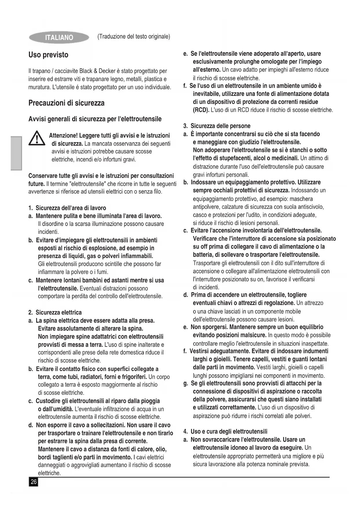 Kevin Hewitt Vice-President Global Engineering Black & Decker Europe, 210 Bath Road, Slough, Berkshire, SL1 3YD Regno Unito 10/03/2010 Garanzia Certa della qualità dei suoi prodotti, Black & Decker offre una garanzia eccezionale. Il presente certicato di garanzia è complementare ai diritti statutari e non li pregiudica in alcun modo. La garanzia è valida entro il territorio degli Stati membri dell'Unione Europea e dell'EFTA (European Free Trade Area). Se un prodotto Black & Decker risulta difettoso per qualità del materiale, della costruzione o per mancata conformità entro 24 mesi dalla data di acquisto, Black & Decker garantisce la sostituzione delle parti difettose, provvede alla riparazione dei prodotti se ragionevolmente usurati oppure alla loro sostituzione, in modo da ridurre al minimo il disagio del cliente a meno che: u Il prodotto non sia stato destinato ad usi commerciali, professionali o al noleggio; u Il prodotto non sia stato usato in modo improprio o scorretto; u Il prodotto non abbia subito danni causati da oggetti o sostanze estranee oppure incidenti; u Il prodotto non abbia subito tentativi di riparazione non effettuati da tecnici autorizzati né dall'assistenza Black & Decker. Per attivare la garanzia è necessario esibire la prova comprovante l'acquisto al venditore o al tecnico autorizzato. Per individuare il tecnico autorizzato più vicino, rivolgersi alla sede Black & Decker locale, presso il recapito indicato nel presente manuale. Altrimenti un elenco completo di tutti i tecnici autorizzati Black & Decker e i dettagli completi sui contatti e i servizi post-vendita sono disponibili su Internet presso: www.2helpU.com I clienti che desiderano registrare il nuovo prodotto Black & Decker e ricevere gli aggiornamenti sui nuovi prodotti e le offerte speciali, sono invitati a visitare il sito Web (www.blackanddecker.it). Ulteriori informazioni sul marchio e la gamma di prodotti Black & Decker sono disponibili all'indirizzo www.blackanddecker.it33 (Vertaling van de originele instructies) NEDERLANDS Gebruik volgens bestemming Uw Black & Decker schroef/boormachine is bedoeld voor het in- en uitdraaien van schroeven en voor het boren in hout, metaal, kunststoffen en zacht metselwerk. Deze machine is uitsluitend bestemd voor consumentengebruik. Veiligheidsvoorschriften Algemene veiligheidswaarschuwingen voor elektrisch gereedschap