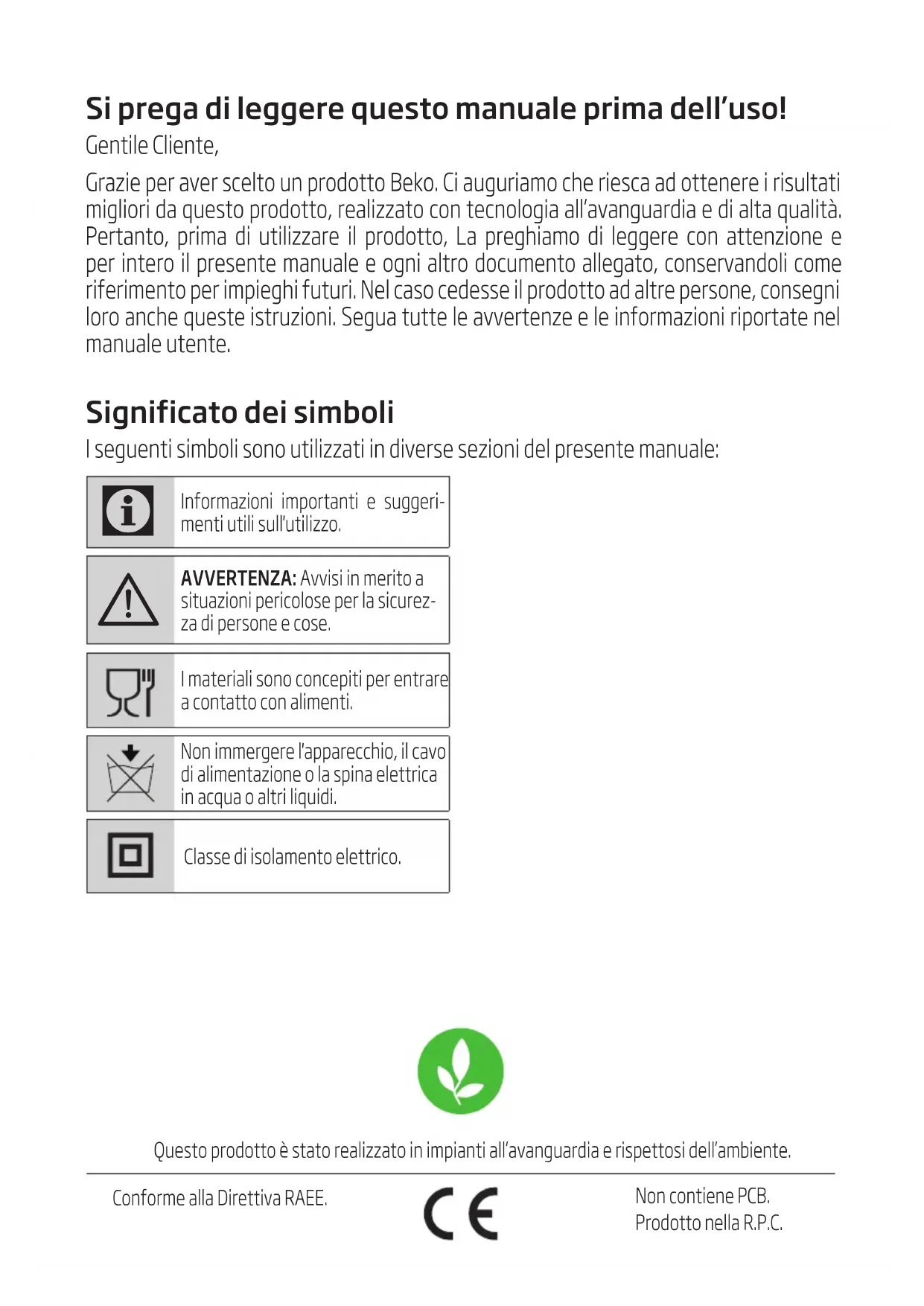 Użytkownikowi dodatkowo i nie wyłącza, nie ogranicza ani nie zawiesza uprawnień Użytkownika wynikających z przepisów o rękojmi za wady rzeczy sprzedanej na podstawie Kodeksu cywilnego.Si prega di leggere questo manuale prima dell’uso! Gentile Cliente, Grazie per aver scelto un prodotto Beko. Ci auguriamo che riesca ad ottenere i risultati migliori da questo prodotto, realizzato con tecnologia all’avanguardia e di alta qualità. Pertanto, prima di utilizzare il prodotto, La preghiamo di leggere con attenzione e per intero il presente manuale e ogni altro documento allegato, conservandoli come riferimento per impieghi futuri. Nel caso cedesse il prodotto ad altre persone, consegni loro anche queste istruzioni. Segua tutte le avvertenze e le informazioni riportate nel manuale utente. Significato dei simboli I seguenti simboli sono utilizzati in diverse sezioni del presente manuale: