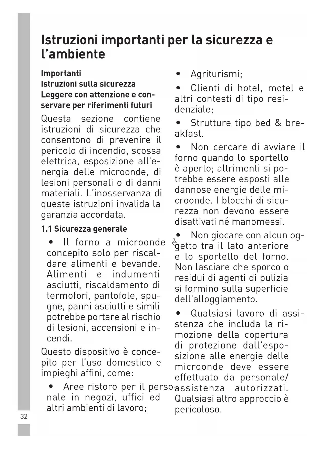 (due to an obstruction in front of the door, low voltage and etc.) Unplug. Then plug again after 10 seconds.32 Istruzioni importanti per la sicurezza e l’ambiente Importanti Istruzioni sulla sicurezza Leggere con attenzione e con- servare per riferimenti futuri Questa sezione contiene istruzioni di sicurezza che consentono di prevenire il pericolo di incendio, scossa elettrica, esposizione all'e- nergia delle microonde, di lesioni personali o di danni materiali. L’inosservanza di queste istruzioni invalida la garanzia accordata.