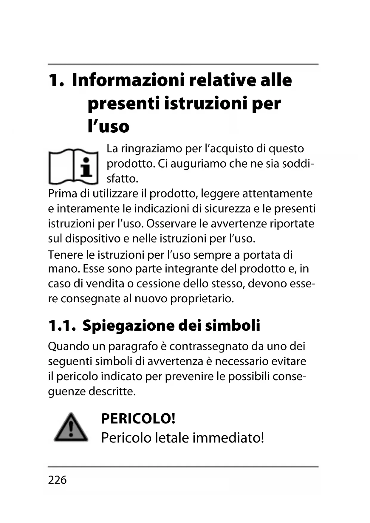 presenti istruzioni per l’uso La ringraziamo per l’acquisto di questo prodotto. Ci auguriamo che ne sia soddi- sfatto. Prima di utilizzare il prodotto, leggere attentamente e interamente le indicazioni di sicurezza e le presenti istruzioni per l’uso. Osservare le avvertenze riportate sul dispositivo e nelle istruzioni per l’uso. Tenere le istruzioni per l’uso sempre a portata di mano. Esse sono parte integrante del prodotto e, in caso di vendita o cessione dello stesso, devono esse- re consegnate al nuovo proprietario. 1.1. Spiegazione dei simboli Quando un paragrafo è contrassegnato da uno dei seguenti simboli di avvertenza è necessario evitare il pericolo indicato per prevenire le possibili conse- guenze descritte. PERICOLO! Pericolo letale immediato!227