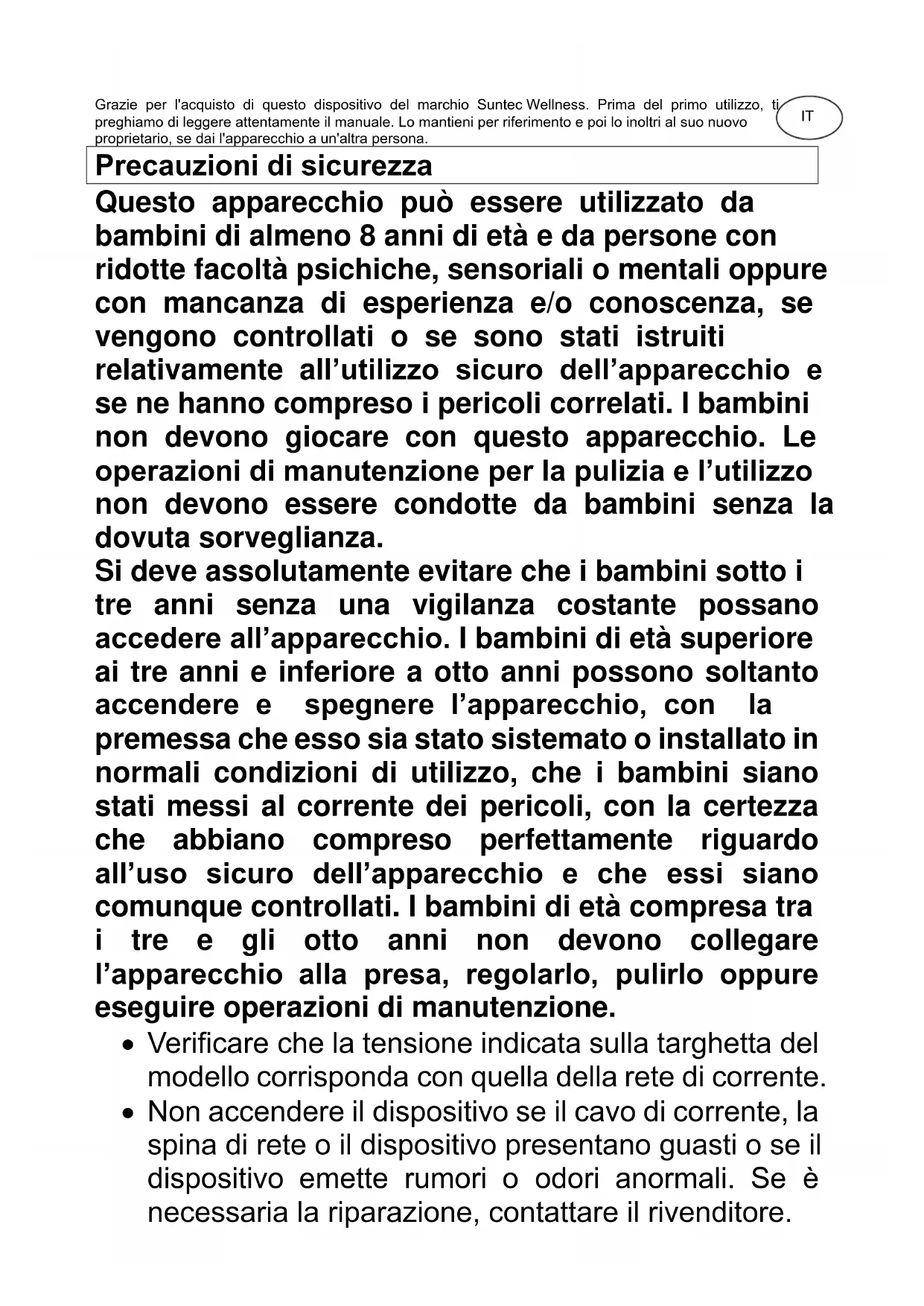 Monsun 6000 black SUNTEC WELLNESS GMBH / HOLZSTRASSE 2 / 40 221 DÜSSELDORF / ALLEMAGNEGrazie per l'acquisto di questo dispositivo del marchio Suntec Wellness. Prima del primo utilizzo, ti preghiamo di leggere attentamente il manuale. Lo mantieni per riferimento e poi lo inoltri al suo nuovo proprietario, se dai l'apparecchio a un'altra persona. Precauzioni di sicurezza Questo apparecchio può essere utilizzato da bambini di almeno 8 anni di età e da persone con ridotte facoltà psichiche, sensoriali o mentali oppure con mancanza di esperienza e/o conoscenza, se vengono controllati o se sono stati istruiti relativamente all’utilizzo sicuro dell’apparecchio e se ne hanno compreso i pericoli correlati. I bambini non devono giocare con questo apparecchio. Le operazioni di manutenzione per la pulizia e l’utilizzo non devono essere condotte da bambini senza la dovuta sorveglianza. Si deve assolutamente evitare che i bambini sotto i tre anni senza una vigilanza costante possano accedere all’apparecchio. I bambini di età superiore ai tre anni e inferiore a otto anni possono soltanto accendere e spegnere l’apparecchio, con la premessa che esso sia stato sistemato o installato in normali condizioni di utilizzo, che i bambini siano stati messi al corrente dei pericoli, con la certezza che abbiano compreso perfettamente riguardo all’uso sicuro dell’apparecchio e che essi siano comunque controllati. I bambini di età compresa tra i tre e gli otto anni non devono collegare l’apparecchio alla presa, regolarlo, pulirlo oppure eseguire operazioni di manutenzione.