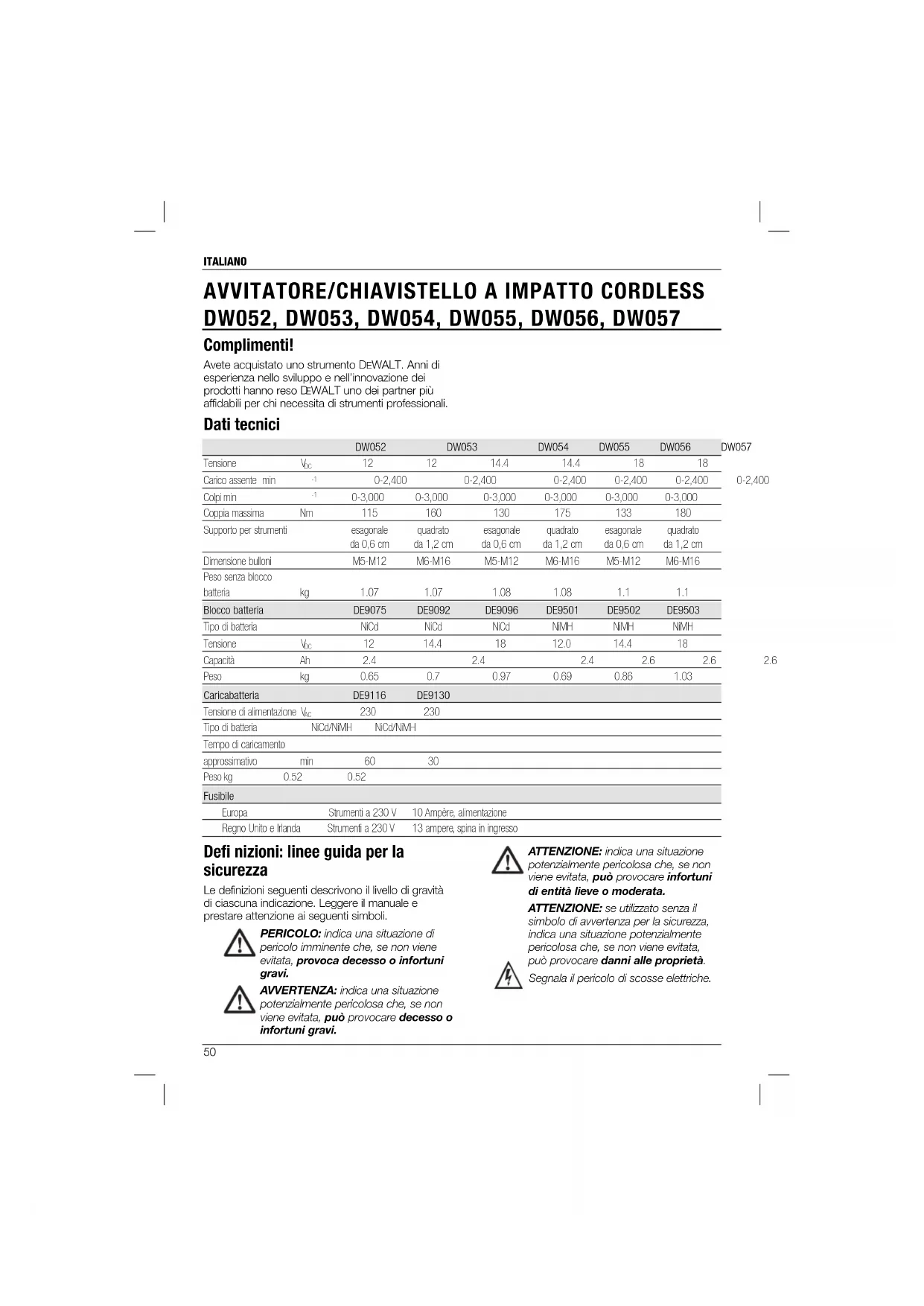 - Prima dell’uso dello strumento, leggere e comprendere il presente manuale. Descrizione (fi g. 1) AVVERTENZA: mai alterare l’elettroutensile o le sue parti. Diversamente, si potrebbero provocare danni o infortuni USO PREVISTO Gli avvitatori/chiavistelli a impatto cordless DW052, DW053, DW054, DW055, DW056 e DW057 sono progettati per applicazioni di avvitamento a impatto professionali. La funzione d’impatto rende questo strumento particolarmente utile nell’inserimento di chiodi nel legno, nel metallo e nel calcestruzzo. NON utilizzare sul bagnato o in presenza di liquidi o gas infiammabili. Gli avvitatori/chiavistelli a impatto cordless sono elettroutensili professionali. NON lasciare che i bambini entrino in contatto con lo strumento. È necessaria la supervisione in presenza di bambini con meno di 16 anni a. Interruttore di velocità variabile b. Cursore avanti/indietro c. Supporto per strumenti d. Impugnatura a pistola e. Blocco batteria f. Pulsanti di rilascio g. Caricabatteria h. Indicatore di carica (rosso) Caricabatteria Il caricabatteria DE9130 supporta blocchi batteria NiCd D EWALT con valori compresi tra 7,2 e 14,4 V. Il caricabatteria DE9116 supporta blocchi batteria NiCd/NiMH D EWALT con valori compresi tra 7,2 e 18 V.ITALIANO
