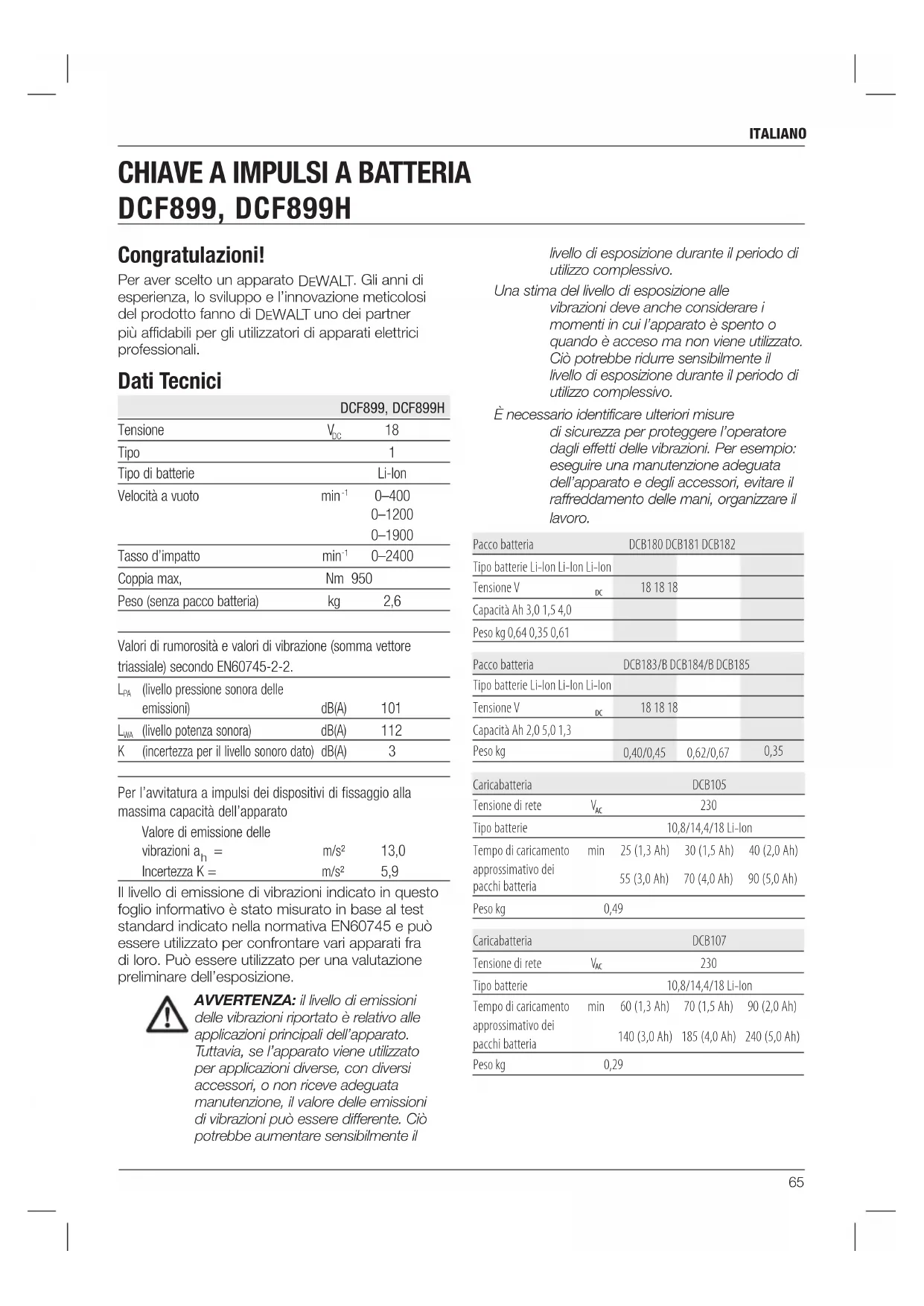 Tipo batterie 10,8/14,4/18 Li-Ion Tempo di caricamento approssimativo dei pacchi batteria min 60 (1,3 Ah) 70 (1,5 Ah) 90 (2,0 Ah) 140 (3,0 Ah) 185 (4,0 Ah) 240 (5,0 Ah) Peso kg 0,29 Congratulazioni! Per aver scelto un apparato DeWALT . Gli anni di esperienza, lo sviluppo e l’innovazione meticolosi del prodotto fanno di DeWALT uno dei partner più affidabili per gli utilizzatori di apparati elettrici professionali. Dati Tecnici