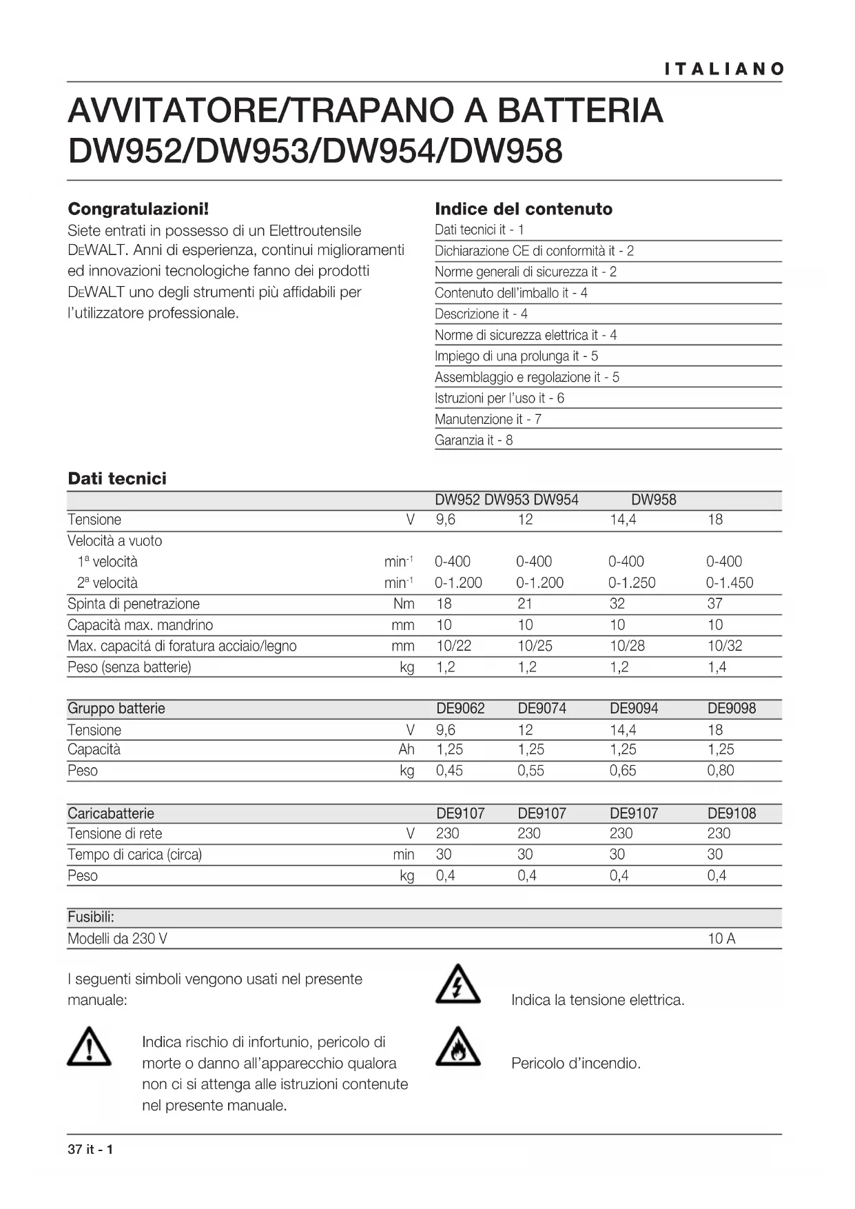 0-1.200 0-1.200 0-1.250 0-1.450 Spinta di penetrazione Nm 18 21 32 37 Capacità max. mandrino mm 10 10 10 10 Max. capacitá di foratura acciaio/legno mm 10/22 10/25 10/28 10/32 Peso (senza batterie) kg 1,2 1,2 1,2 1,4 Gruppo batterie DE9062 DE9074 DE9094 DE9098 Tensione V 9,6 12 14,4 18 Capacità Ah 1,25 1,25 1,25 1,25 Peso kg 0,45 0,55 0,65 0,80 Caricabatterie DE9107 DE9107 DE9107 DE9108 Tensione di rete V 230 230 230 230 Tempo di carica (circa) min 30 30 30 30 Peso kg 0,4 0,4 0,4 0,4 Fusibili: Modelli da 230 V 10 A I seguenti simboli vengono usati nel presente manuale: Indica rischio di infortunio, pericolo di morte o danno all’apparecchio qualora non ci si attenga alle istruzioni contenute nel presente manuale. Indica la tensione elettrica. Pericolo d’incendio.it - 2 38 ITALIANO Dichiarazione CE di conformità DW952/DW953/DW954/DW958 DEWALT dichiara che gli Elettroutensili sono stati costruiti in conformità alle norme: 89/392/CEE, 89/336/CEE, 73/23/CEE, EN 50144, EN 55104 / EN 55014-2, EN 55014, EN 61000-3-2 & EN 61000-3-3. Per ulteriori informazioni, contattare DEWALT nel indirizzo qui sotto o consultare il retro del presente manuale. Il livello di rumorosità è conforme alle norme 86/188/CEE e 89/392/CEE, dati ricavati in base alla norma EN 50144: DW952 DW953 DW954 DW958