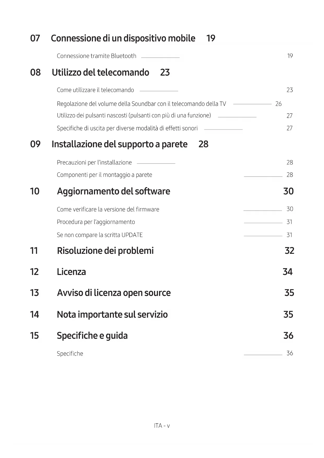 - L’aggiornamento tramite USB potrebbe non essere disponibile, a seconda del produttore del dispositivo di archiviazione.ITA - 32 LaSoundbarnonsiaccende. ; Assicurarsi che il cavo di alimentazione della Soundbar sia inserita correttamente nella presa. LaSoundbarfunzionainmodononregolare. ; Disinserire e reinserire il cavo di alimentazione. ; Rimuovere il cavo di alimentazione dal dispositivo esterno e riprovare. ; In assenza di segnale, la Soundbar si spegne automaticamente dopo un certo periodo di tempo. Accendere la Soundbar. (Andare a pagina 3.) Seiltelecomandononfunziona. ; Puntare il telecomando direttamente sulla Soundbar. ; Sostituire le batterie. LaSoundbarnonemettesuoni. ; Il volume della Soundbar è troppo basso o azzerato. Regolare il volume. ; Quando è connesso un dispositivo esterno (STB, dispositivo Bluetooth, dispositivo mobile e così via), regolare il volume del dispositivo esterno. ; Per l’uscita audio della TV, selezionare Soundbar. (TV Samsung: Home (