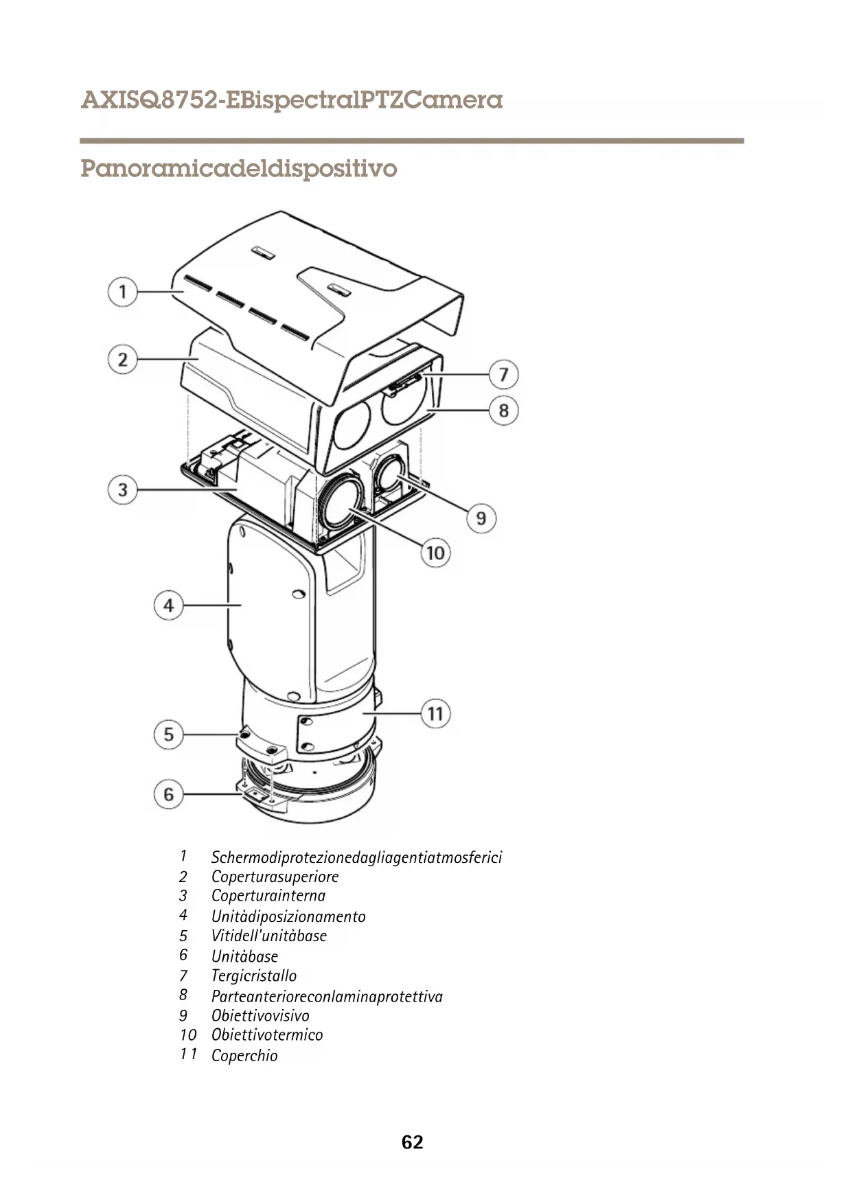 ITAXISQ8752-EBispectralPTZCamera Comeinstallareildispositivo PERICOLO Rischiodiscosseelettriche.Tuttiicavinonsarannosottotensioneprimadiinstallareil dispositivo. ATTENZIONE Leconnessionielettricheel'installazionedeitubiprotettividevonoessereeffettuatedaun elettricistacerticatoeinconformitàallenormativelocali. ATTENZIONE Rischiodilesioni.Partiinmovimento.Tenereilcorpoadistanzadaldispositivo duranteilfunzionamento.Scollegaredall'alimentazioneprimadiinstallareoeseguire lamanutenzionesuldispositivo. ATTENZIONE Rischiodilesioni.Superciecalda.Nontoccareildispositivoduranteilfunzionamento. Scollegaredall'alimentazioneelasciarraffreddarelesuperciprimadieseguirela manutenzionesuldispositivo. Montaggiodell'unitàbase