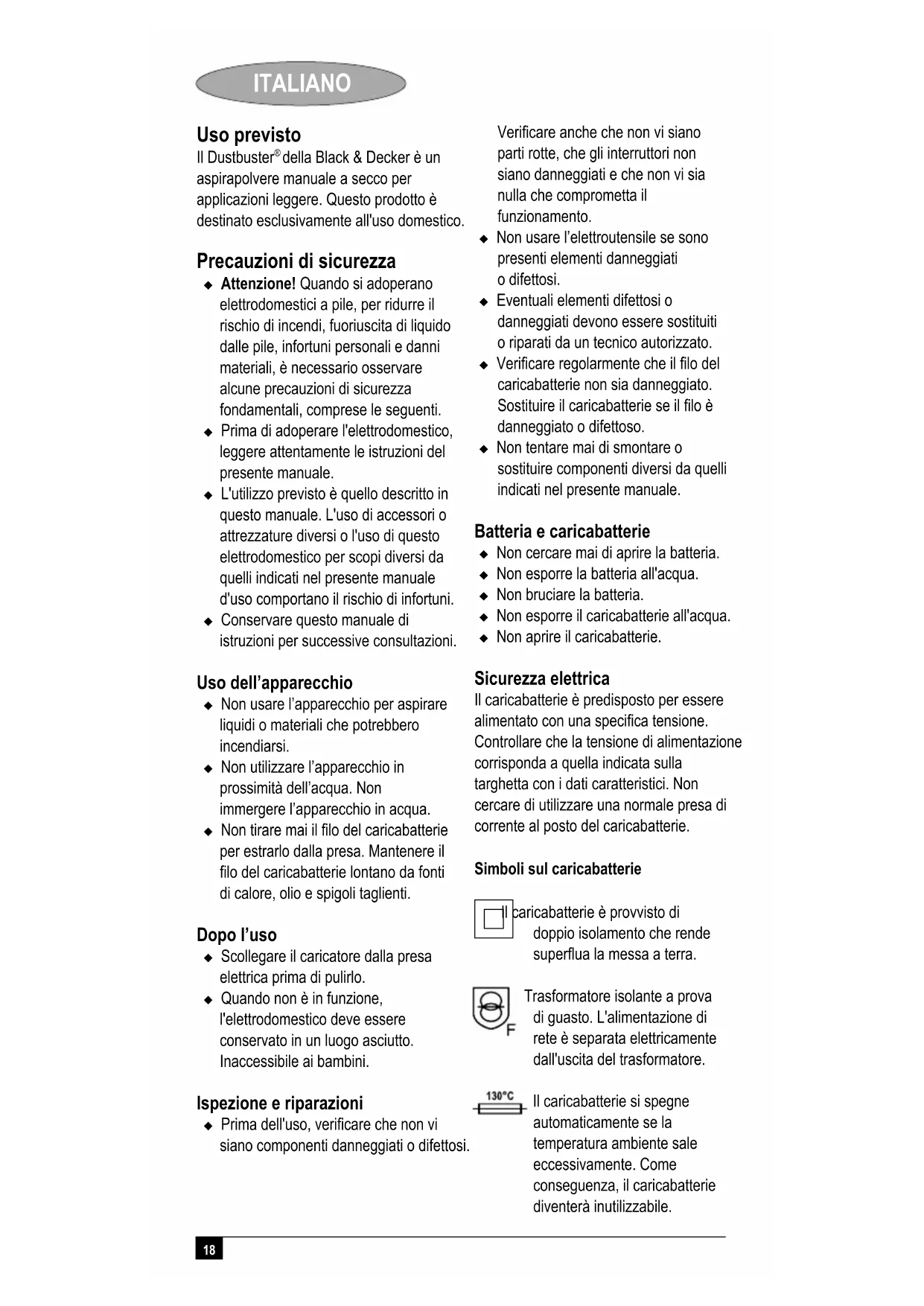 della Black & Decker è un aspirapolvere manuale a secco per applicazioni leggere. Questo prodotto è destinato esclusivamente all'uso domestico. Precauzioni di sicurezza Attenzione! Quando si adoperano elettrodomestici a pile, per ridurre il rischio di incendi, fuoriuscita di liquido dalle pile, infortuni personali e danni materiali, è necessario osservare alcune precauzioni di sicurezza fondamentali, comprese le seguenti. Prima di adoperare l'elettrodomestico, leggere attentamente le istruzioni del presente manuale. L'utilizzo previsto è quello descritto in questo manuale. L'uso di accessori o attrezzature diversi o l'uso di questo elettrodomestico per scopi diversi da quelli indicati nel presente manuale d'uso comportano il rischio di infortuni. Conservare questo manuale di istruzioni per successive consultazioni. Uso dell’apparecchio Non usare l’apparecchio per aspirare liquidi o materiali che potrebbero incendiarsi. Non utilizzare l’apparecchio in prossimità dell’acqua. Non immergere l’apparecchio in acqua. Non tirare mai il filo del caricabatterie per estrarlo dalla presa. Mantenere il filo del caricabatterie lontano da fonti di calore, olio e spigoli taglienti. Dopo l’uso Scollegare il caricatore dalla presa elettrica prima di pulirlo. Quando non è in funzione, l'elettrodomestico deve essere conservato in un luogo asciutto. Inaccessibile ai bambini. Ispezione e riparazioni Prima dell'uso, verificare che non vi siano componenti danneggiati o difettosi. Verificare anche che non vi siano parti rotte, che gli interruttori non siano danneggiati e che non vi sia nulla che comprometta il funzionamento. Non usare l’elettroutensile se sono presenti elementi danneggiati o difettosi. Eventuali elementi difettosi o danneggiati devono essere sostituiti o riparati da un tecnico autorizzato. Verificare regolarmente che il filo del caricabatterie non sia danneggiato. Sostituire il caricabatterie se il filo è danneggiato o difettoso. Non tentare mai di smontare o sostituire componenti diversi da quelli indicati nel presente manuale. Batteria e caricabatterie Non cercare mai di aprire la batteria. Non esporre la batteria all'acqua. Non bruciare la batteria. Non esporre il caricabatterie all'acqua. Non aprire il caricabatterie. Sicurezza elettrica Il caricabatterie è predisposto per essere alimentato con una specifica tensione. Controllare che la tensione di alimentazione corrisponda a quella indicata sulla targhetta con i dati caratteristici. Non cercare di utilizzare una normale presa di corrente al posto del caricabatterie. Simboli sul caricabatterie