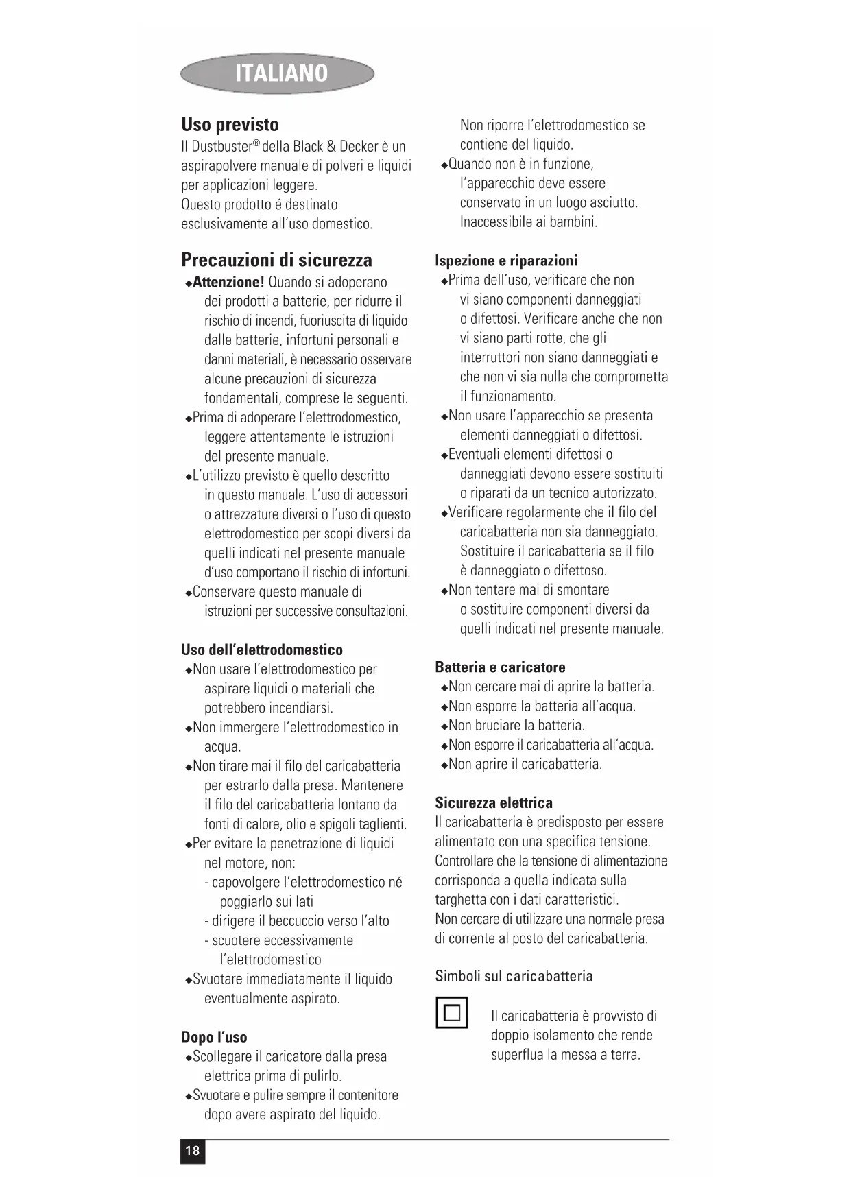 della Black & Decker è un aspirapolvere manuale di polveri e liquidi per applicazioni leggere. Questo prodotto é destinato esclusivamente all’uso domestico. Precauzioni di sicurezza ◆ Attenzione! Quando si adoperano dei prodotti a batterie, per ridurre il rischio di incendi, fuoriuscita di liquido dalle batterie, infortuni personali e danni materiali, è necessario osservare alcune precauzioni di sicurezza fondamentali, comprese le seguenti. ◆ Prima di adoperare l’elettrodomestico, leggere attentamente le istruzioni del presente manuale. ◆ L’utilizzo previsto è quello descritto in questo manuale. L’uso di accessori o attrezzature diversi o l’uso di questo elettrodomestico per scopi diversi da quelli indicati nel presente manuale d’uso comportano il rischio di infortuni. ◆ Conservare questo manuale di istruzioni per successive consultazioni. Uso dell’elettrodomestico ◆ Non usare l’elettrodomestico per aspirare liquidi o materiali che potrebbero incendiarsi. ◆ Non immergere l’elettrodomestico in acqua. ◆ Non tirare mai il filo del caricabatteria per estrarlo dalla presa. Mantenere il filo del caricabatteria lontano da fonti di calore, olio e spigoli taglienti. ◆ Per evitare la penetrazione di liquidi nel motore, non: - capovolgere l’elettrodomestico né poggiarlo sui lati - dirigere il beccuccio verso l’alto - scuotere eccessivamente l’elettrodomestico ◆ Svuotare immediatamente il liquido eventualmente aspirato. Dopo l’uso ◆ Scollegare il caricatore dalla presa elettrica prima di pulirlo. ◆ Svuotare e pulire sempre il contenitore dopo avere aspirato del liquido. Non riporre l’elettrodomestico se contiene del liquido. ◆ Quando non è in funzione, l’apparecchio deve essere conservato in un luogo asciutto. Inaccessibile ai bambini. Ispezione e riparazioni ◆ Prima dell’uso, verificare che non vi siano componenti danneggiati o difettosi. Verificare anche che non vi siano parti rotte, che gli interruttori non siano danneggiati e che non vi sia nulla che comprometta il funzionamento. ◆ Non usare l’apparecchio se presenta elementi danneggiati o difettosi. ◆ Eventuali elementi difettosi o danneggiati devono essere sostituiti o riparati da un tecnico autorizzato. ◆ Verificare regolarmente che il filo del caricabatteria non sia danneggiato. Sostituire il caricabatteria se il filo è danneggiato o difettoso. ◆ Non tentare mai di smontare o sostituire componenti diversi da quelli indicati nel presente manuale. Batteria e caricatore ◆ Non cercare mai di aprire la batteria. ◆ Non esporre la batteria all’acqua. ◆ Non bruciare la batteria. ◆ Non esporre il caricabatteria all’acqua. ◆ Non aprire il caricabatteria. Sicurezza elettrica Il caricabatteria è predisposto per essere alimentato con una specifica tensione. Controllare che la tensione di alimentazione corrisponda a quella indicata sulla targhetta con i dati caratteristici. Non cercare di utilizzare una normale presa di corrente al posto del caricabatteria. Simboli sul caricabatteria Il caricabatteria è provvisto di doppio isolamento che rende superflua la messa a terra.19 ITALIANO Trasformatore isolante a prova di guasto. L’alimentazione di rete è separata elettricamente dall’uscita del trasformatore. Il caricabatteria si spegne automaticamente se la temperatura ambiente sale eccessivamente e ricomincia a funzionare non appena la temperatura ambiente diminuisce. Il caricabatteria è destinato ad essere usato esclusivamente in ambienti interni. Prima di adoperare l’elettrodomestico, leggere attentamente le istruzioni del presente manuale. Caratteristiche