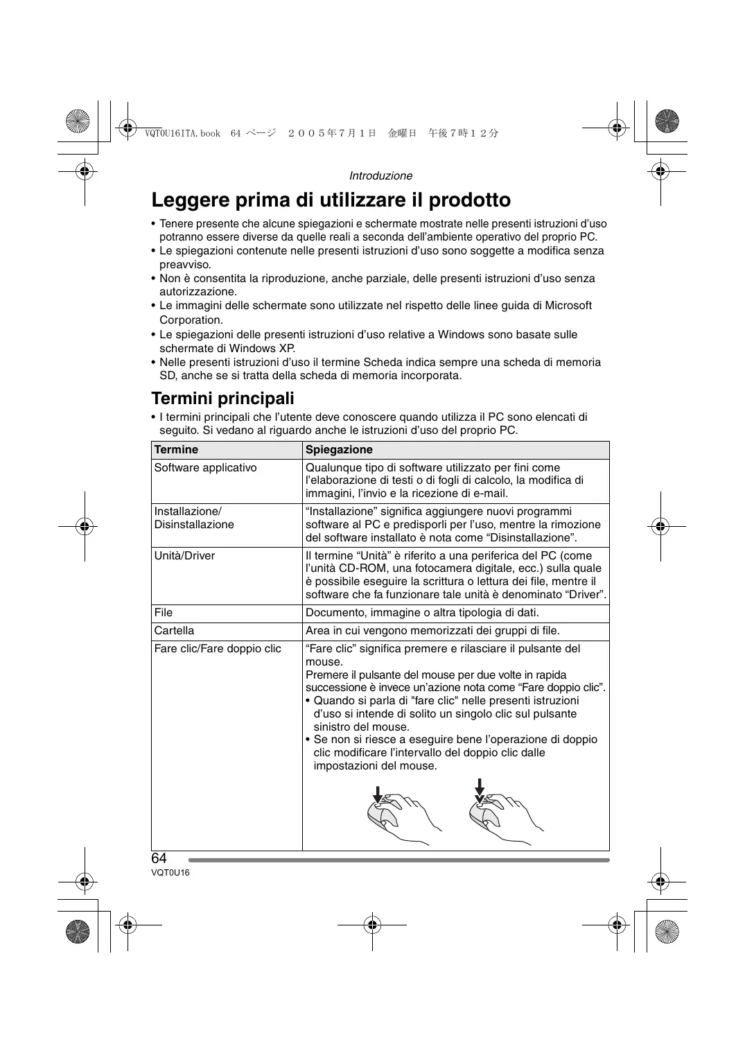 - I termini principali che l’utente deve conoscere quando utilizza il PC sono elencati di seguito. Si vedano al riguardo anche le istruzioni d’uso del proprio PC. Termine Spiegazione Software applicativo Qualunque tipo di software utilizzato per fini come l’elaborazione di testi o di fogli di calcolo, la modifica di immagini, l’invio e la ricezione di e-mail. Installazione/ Disinstallazione “Installazione” significa aggiungere nuovi programmi software al PC e predisporli per l’uso, mentre la rimozione del software installato è nota come “Disinstallazione”. Unità/Driver Il termine “Unità” è riferito a una periferica del PC (come l’unità CD-ROM, una fotocamera digitale, ecc.) sulla quale è possibile eseguire la scrittura o lettura dei file, mentre il software che fa funzionare tale unità è denominato “Driver”. File Documento, immagine o altra tipologia di dati. Cartella Area in cui vengono memorizzati dei gruppi di file. Fare clic/Fare doppio clic “Fare clic” significa premere e rilasciare il pulsante del mouse. Premere il pulsante del mouse per due volte in rapida successione è invece un’azione nota come “Fare doppio clic”.