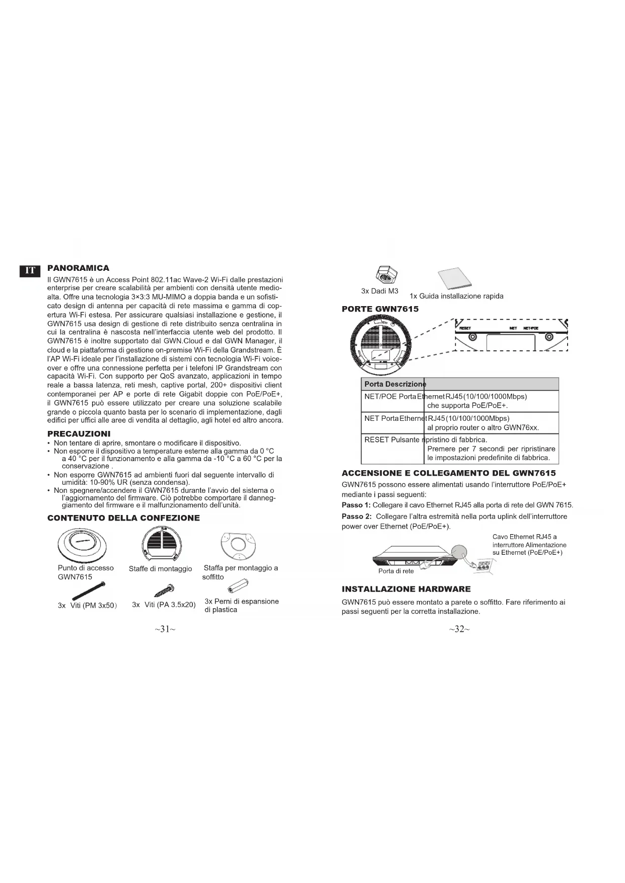 Il GWN7615 è un Access Point 802.11ac Wave-2 Wi-Fi dalle prestazioni enterprise per creare scalabilità per ambienti con densità utente medio- alta. Offre una tecnologia 3×3:3 MU-MIMO a doppia banda e un sosti- cato design di antenna per capacità di rete massima e gamma di cop- ertura Wi-Fi estesa. Per assicurare qualsiasi installazione e gestione, il GWN7615 usa design di gestione di rete distribuito senza centralina in cui la centralina è nascosta nell’interfaccia utente web del prodotto. Il GWN7615 è inoltre supportato dal GWN.Cloud e dal GWN Manager, il cloud e la piattaforma di gestione on-premise Wi-Fi della Grandstream. È l’AP Wi-Fi ideale per l’installazione di sistemi con tecnologia Wi-Fi voice- over e offre una connessione perfetta per i telefoni IP Grandstream con capacità Wi-Fi. Con supporto per QoS avanzato, applicazioni in tempo reale a bassa latenza, reti mesh, captive portal, 200+ dispositivi client contemporanei per AP e porte di rete Gigabit doppie con PoE/PoE+, il GWN7615 può essere utilizzato per creare una soluzione scalabile grande o piccola quanto basta per lo scenario di implementazione, dagli edici per ufci alle aree di vendita al dettaglio, agli hotel ed altro ancora. PRECAUZIONI