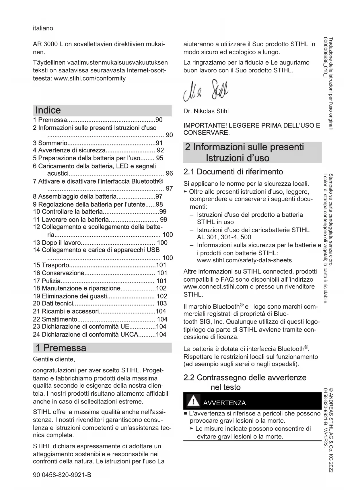 - 24 Dichiarazione di conformità UKCA 1 Premessa Gentile cliente, congratulazioni per aver scelto STIHL. Proget‐ tiamo e fabbrichiamo prodotti della massima qualità secondo le esigenze della nostra clien‐ tela. I nostri prodotti risultano altamente affidabili anche in caso di sollecitazioni estreme. STIHL offre la massima qualità anche nell'assi‐ stenza. I nostri rivenditori garantiscono consu‐ lenza e istruzioni competenti e un'assistenza tec‐ nica completa. STIHL dichiara espressamente di adottare un atteggiamento sostenibile e responsabile nei confronti della natura. Le istruzioni per l'uso La aiuteranno a utilizzare il Suo prodotto STIHL in modo sicuro ed ecologico a lungo. La ringraziamo per la fiducia e Le auguriamo buon lavoro con il Suo prodotto STIHL. Dr. Nikolas Stihl p. 104